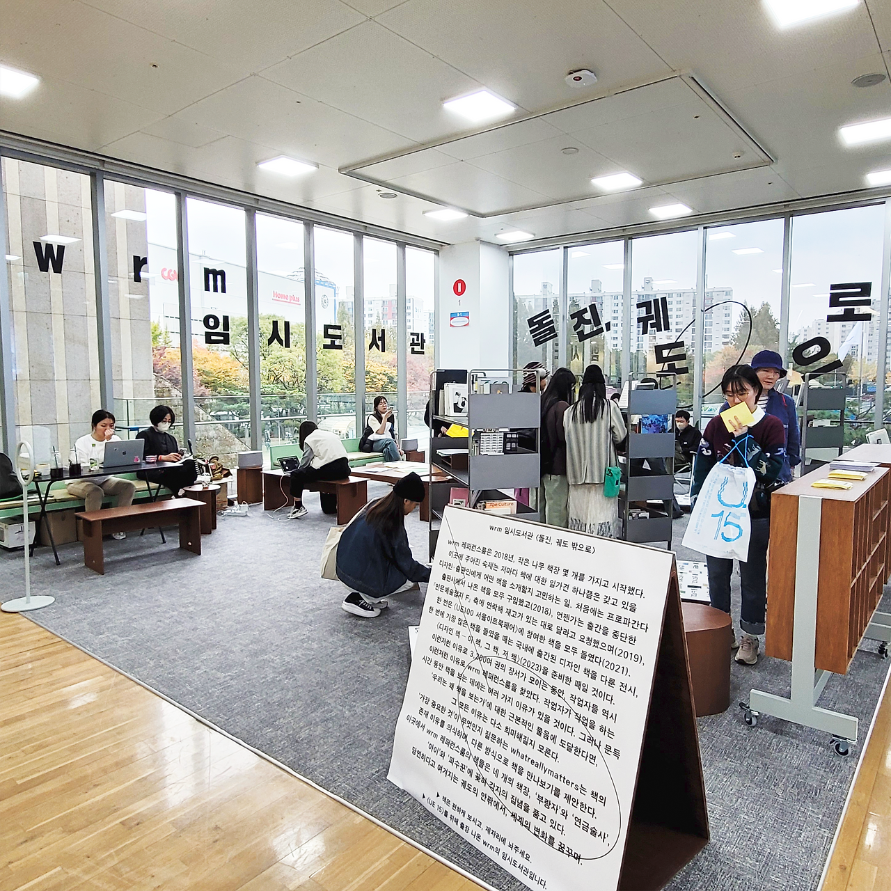 2층에 도착하자 UE 2023 북페어의 주요 행사들이 이루어지는 ‘프로그램 룸’이 모습을 드러냈다. 강연과 북토크가 진행되고, ‘모두의 프로그램’ 코너가 있으며, 방명록을 남길 수 있는 커다란 복합 공간. 프로그램 룸에 들어설 때쯤에는 한 북토크가 시작되고 있었는데, 난 한 귀로 틈틈이 강연을 엿들으며, ‘모두의 프로그램’ 코너를 둘러보았다.