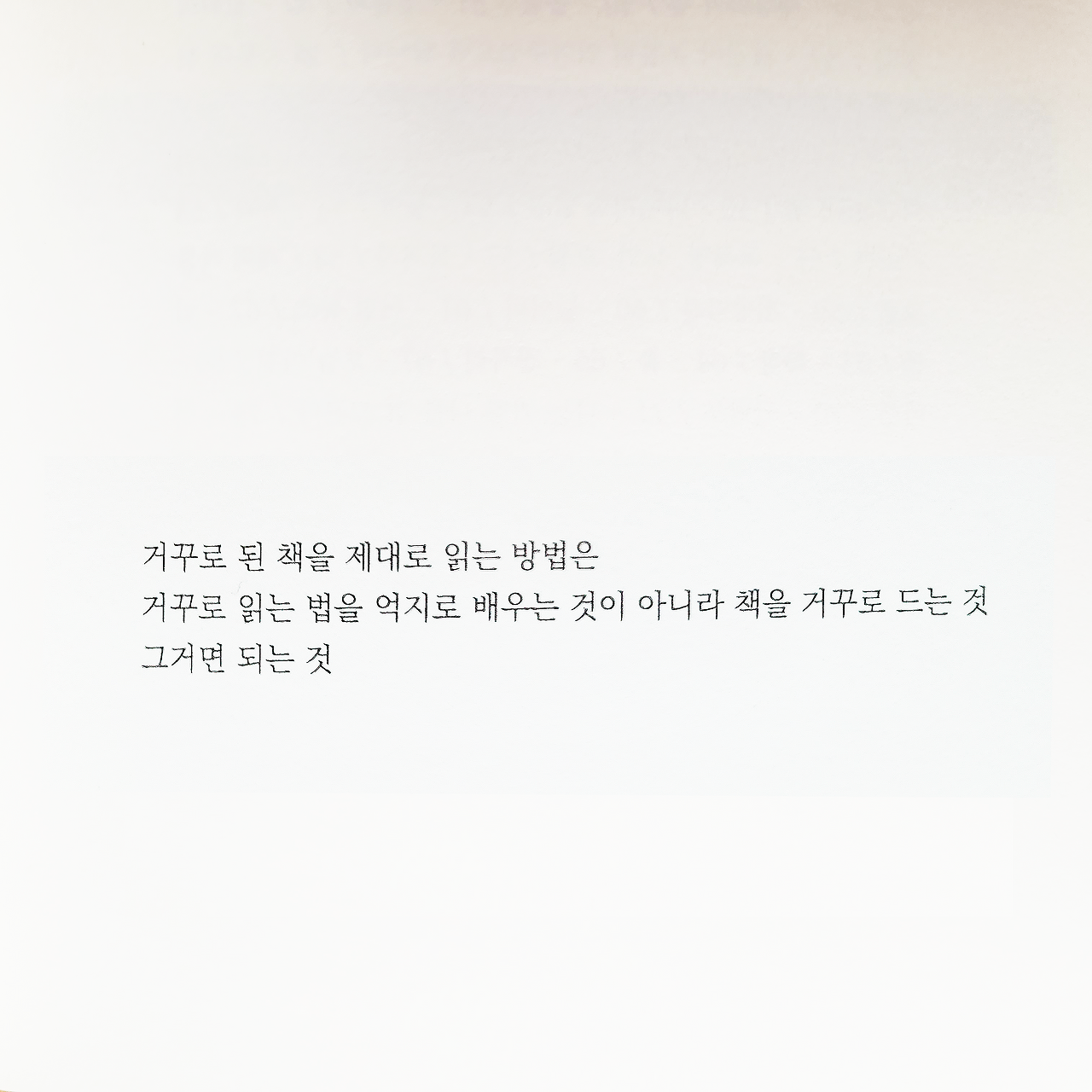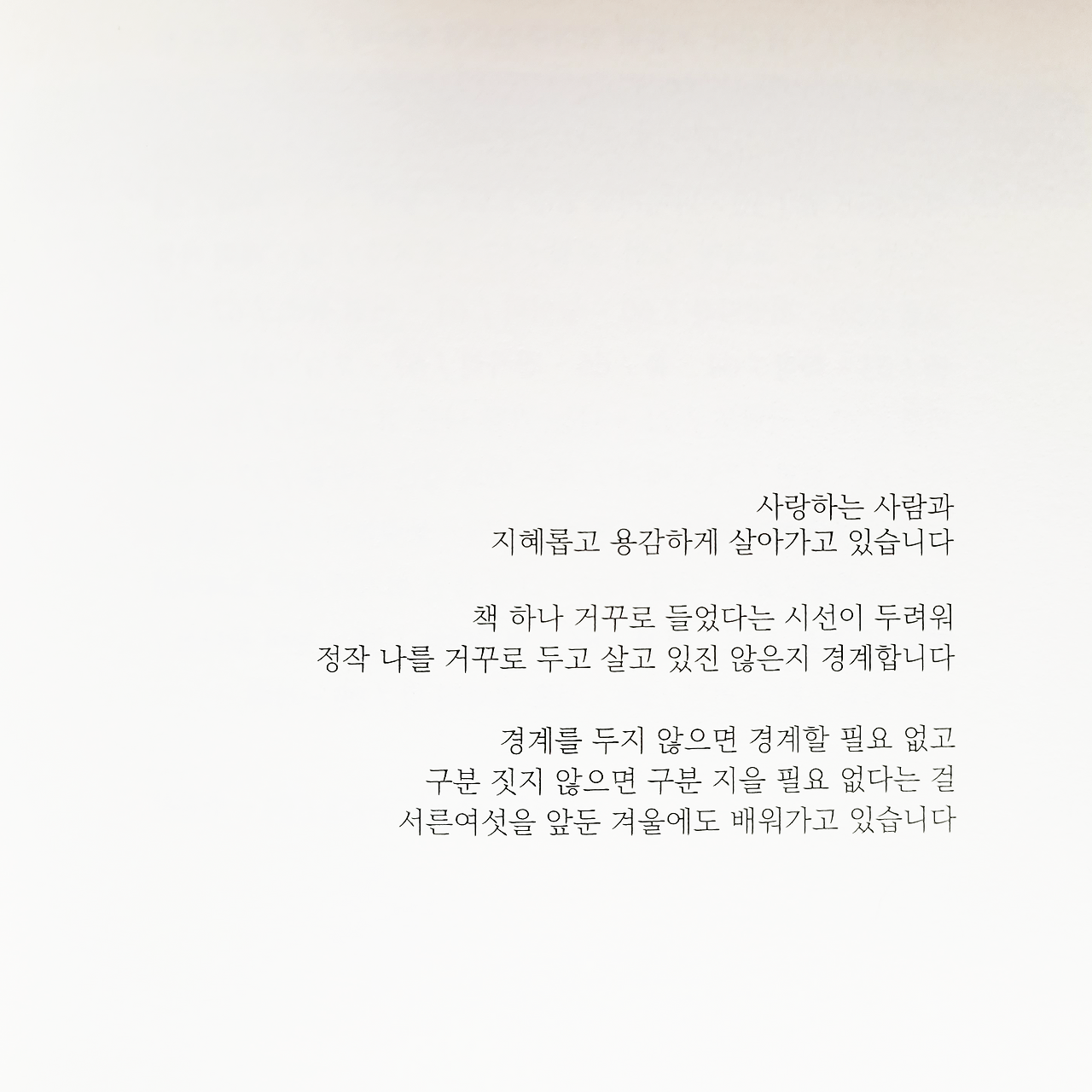 책 하나 거꾸로 들었다는 시선이 두려워 정작 나를 거꾸로 두고 살고 있진 않은지 경계합니다. 경계를 두지 않으면 경계할 필요 없고, 구분 짓지 않으면 구분 지을 필요 없다는 걸, 서른여섯을 앞둔 겨울에도 배워가고 있습니다.