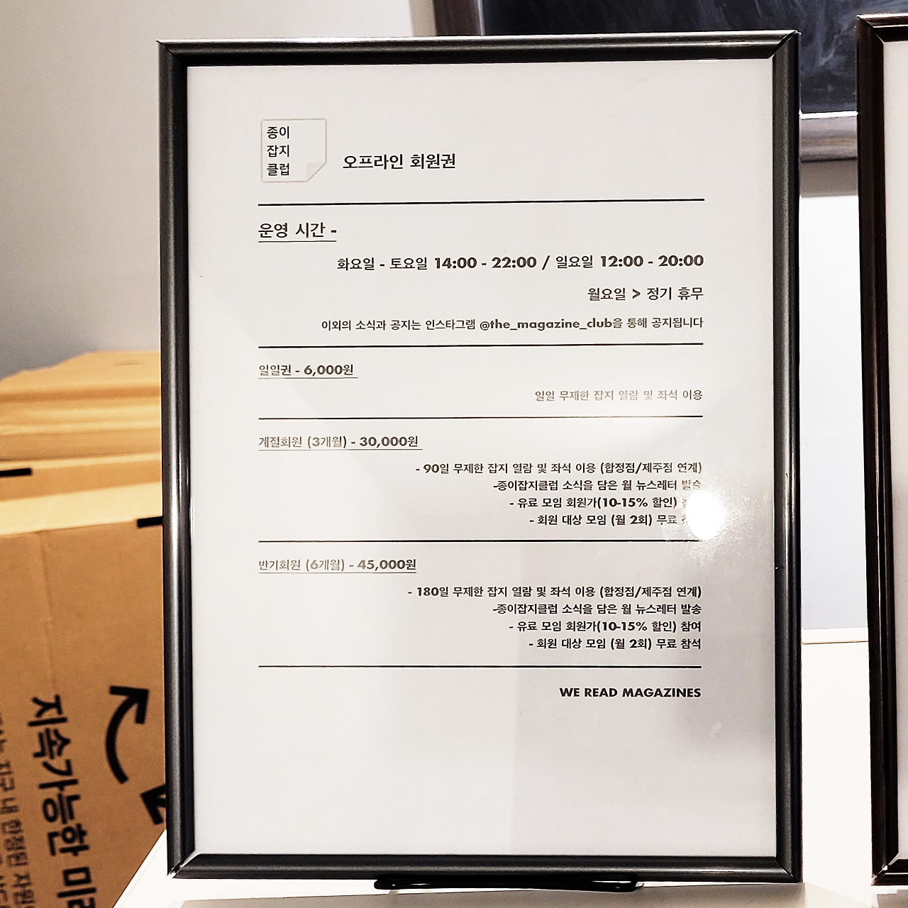 1. 서점의 회원권에는 1일, 3개월, 6개월 권이 있으며, 서점 1일 이용권 가격은 고작 6,000원이다. (앗, 잡지 클럽 이용료가 잡지 한 권보다 싸다!) 또한 3개월이나 6개월 회원권을 구매하면 그 기간 내에 자유롭게 서점을 들락거리며 서점의 모든 잡지를 무제한으로 읽을 수 있다.