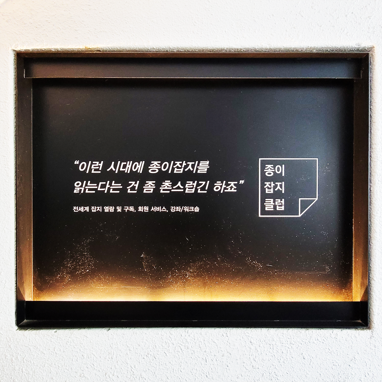 : 손님에 맞게 잡지를 큐레이션해 주는 서점이다. 선호하는 키워드나 장르를 말하면 책방지기님께서 직접 잡지를 골라 자리까지 가져다준다. 여러 권의 잡지를 하나씩 보여주며 추천하는 이유도 설명해 주신다. 그래서 종이잡지클럽은 잡지를 잘 몰라도 얼마든지 놀러 갈 수 있다. 그곳에는 내 입맛에 맞는 잡지를 알아서 찾아주시는 잡지 큐레이터가 있기 때문에.
