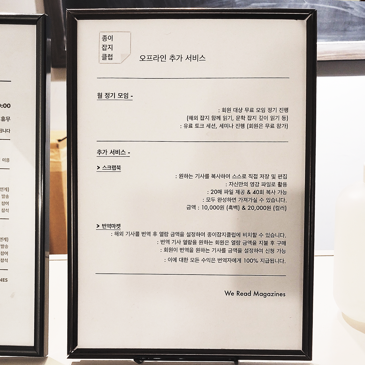 : ‘잡지 전문 서점’이라는 이름답게 전 세계의 온갖 잡지가 책장을 채우고 있다. 그리고 놀라운 사실, 종이잡지클럽에서는 이 모든 잡지를 ‘구매 없이도’ 마음껏 읽을 수 있다. 서점 이용권(하루, 3개월, 6개월)만 구매하면 서점의 모든 잡지를 자유롭게 열람이 가능하다. 물론, 읽다가 마음에 드는 잡지가 있다면 구매도 할 수 있다.