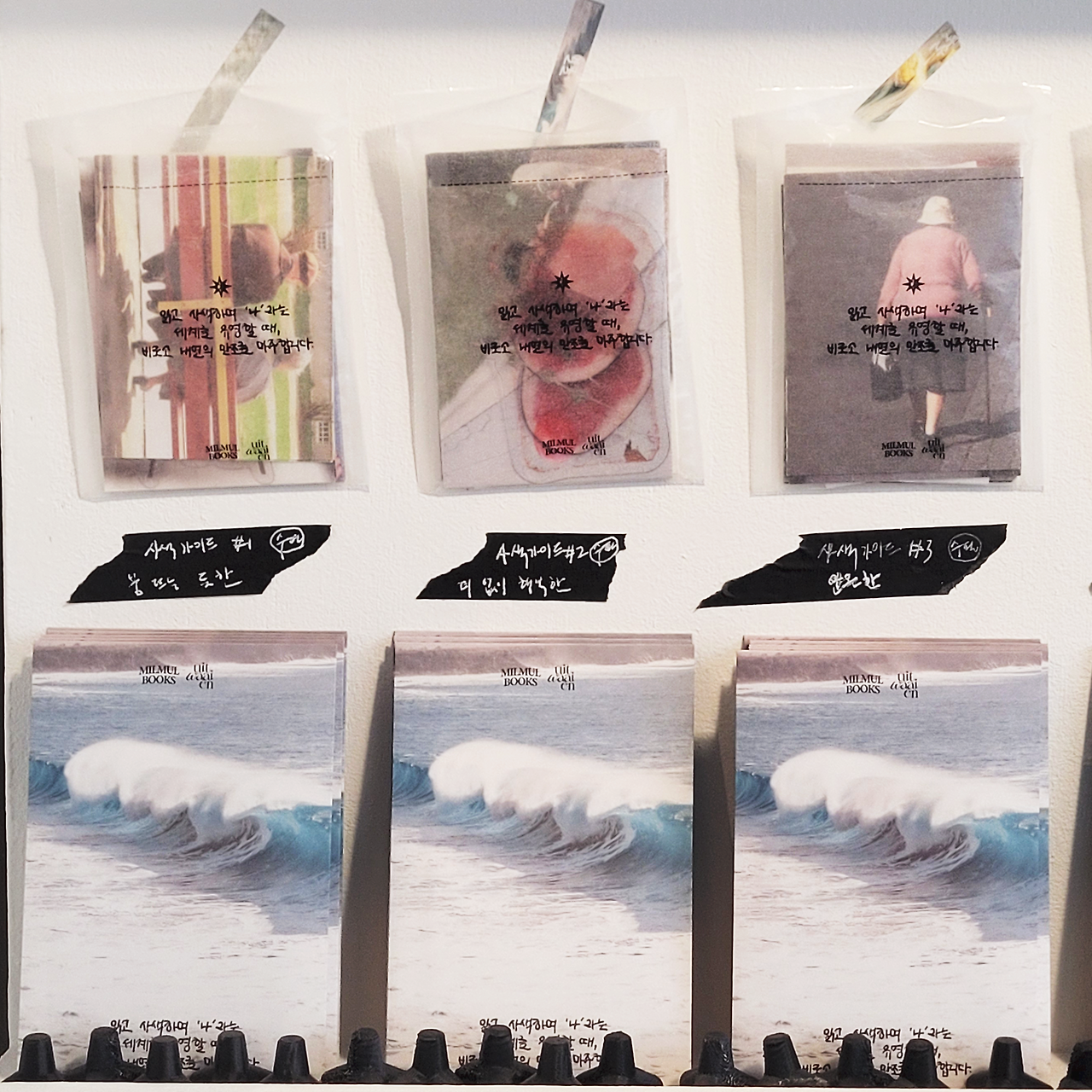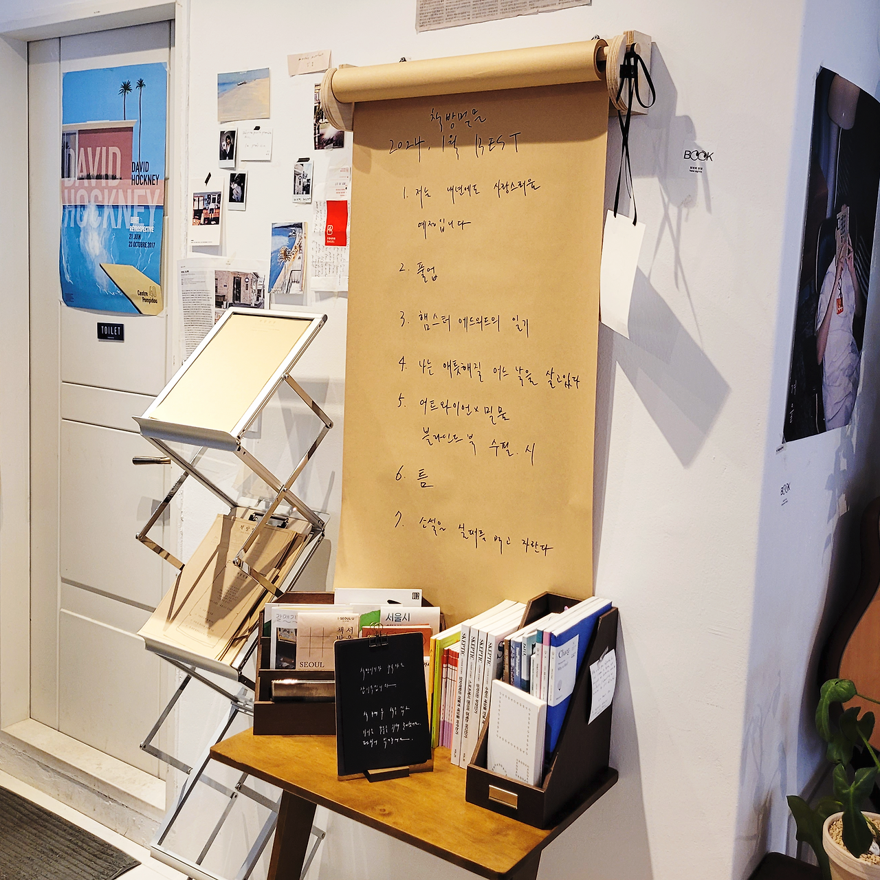 : 책방의 책장에는 무수히 많은 메모가 붙어 있다. 전부 책방지기님이 손수 적은 메모들이다. 하지만 여러 메모 중 단연 눈에 띄는 건 책방의 ‘샘플북’이다. 책방의 손님들은 샘플북에 적힌 책방지기님의 메모를 즐겨 읽으며, 메모에 반해 책을 구매하기도 한다.