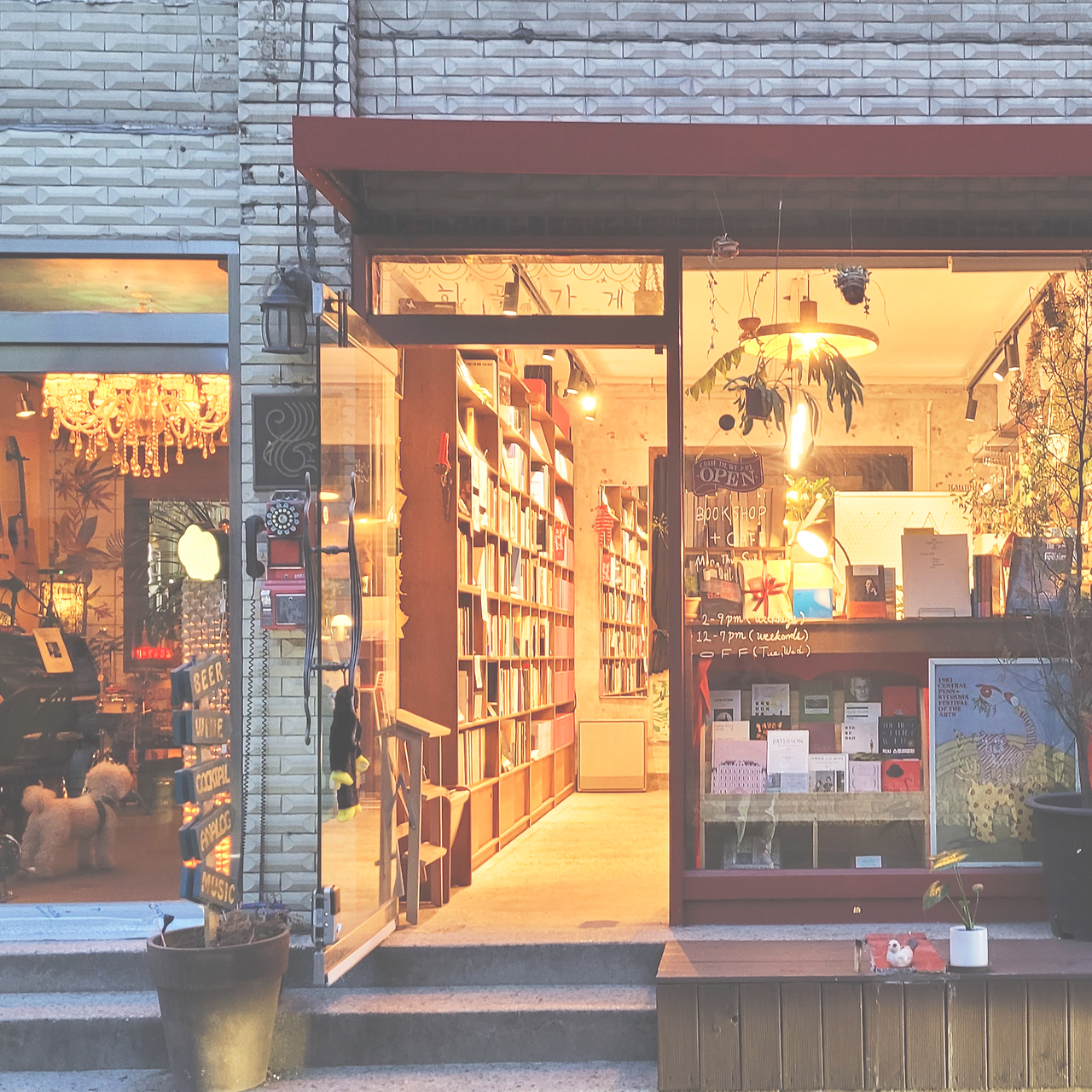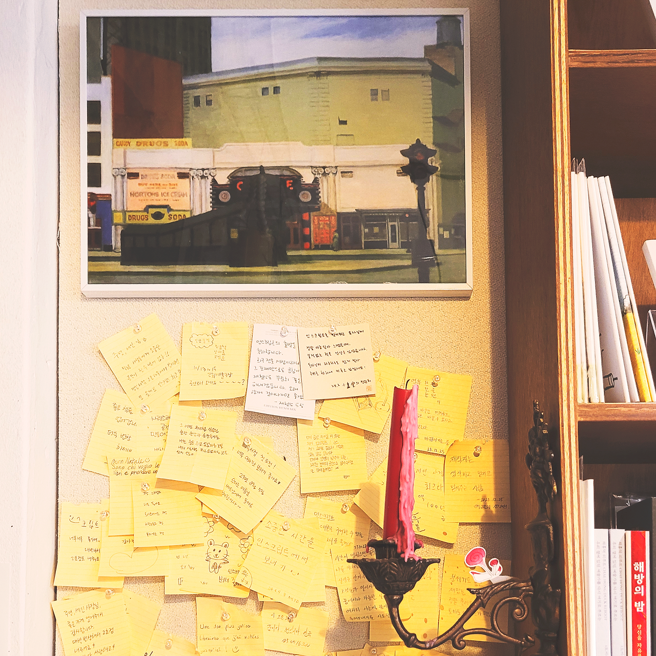 : 오프라인 서점에서 자주 접할 수 없는 책들이 많아 공연ㆍ예술인들이 종종 찾는 서점이다. 서점을 잘 살피다 보면 서점에 드나드는 배우나 예술인들이 남긴 흔적이나 메모, 전시들도 발견할 수 있다. 깨알 재미가 있는 서점이니 책장 외의 소품들도 찬찬히 살펴보자. 의외의 요소를 발견할 수 있을지도 모르니!