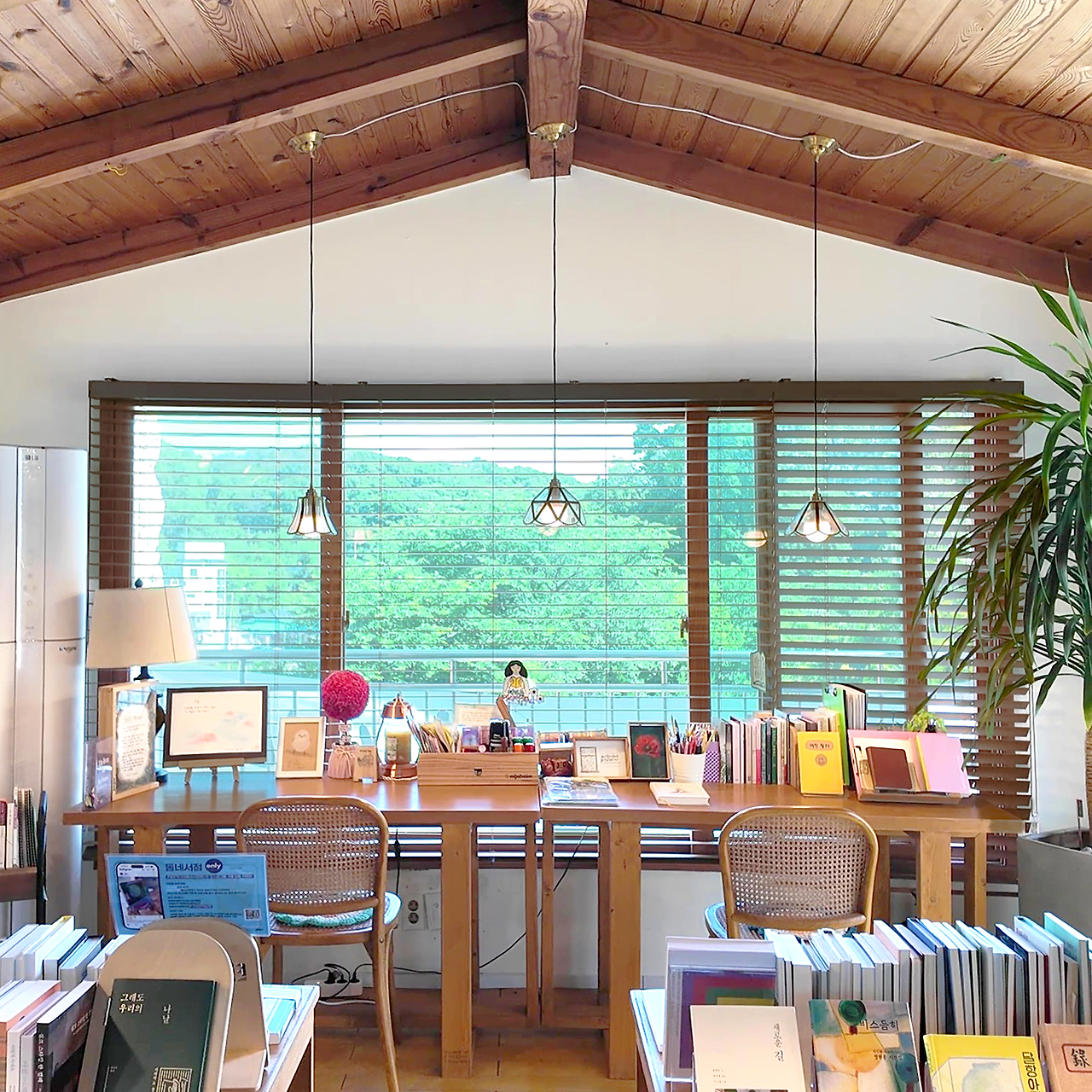 ‘사각사각’이라는 책방의 이름에서 알 수 있는 것처럼 필사를 장기이자 특징으로 내세우는 필사 전문 서점이며, 정기적으로 필사 모임도 이루어지는 곳이다. 의왕시 교외에 있는 서점이라 창밖으로 보이는 푸른 녹음이 아름다우며, 서점의 높이 솟은 지붕과 목재 인테리어도 아름다움에 한 몫을 보탠다. 드넓은 발코니도 있어 날씨가 좋은 계절에는 밖에 앉아 책도 읽을 수 있으니, 한적한 주말이나 오후, 휴일에 방문해 오랜 시간 즐기기 좋은 듯하다.