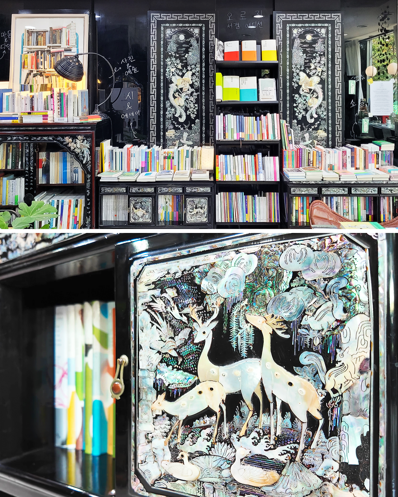 전통적인 아름다움을 현대적으로 해석한, 이색적인 멋이 있는 서점이다. 어릴 때부터 자개장에 대한 애착이 남달랐던 책방지기님은 (현재까지도 정정하게 살아계시지만 오래된 자개장들을 떠나보낼 이유가 있었던) 외할머니께 자개장을 물려받게 되며, 서점을 시작했다고 한다. 서점을 여는 것이 오랜 바람이었고, 자개장 역시 오랜 취향이었기에, 두 가지가 맞물리는 순간 ‘자개장으로 꾸며진 서점’을 열 결심이 서서 곧바로 실천하게 되었다고.