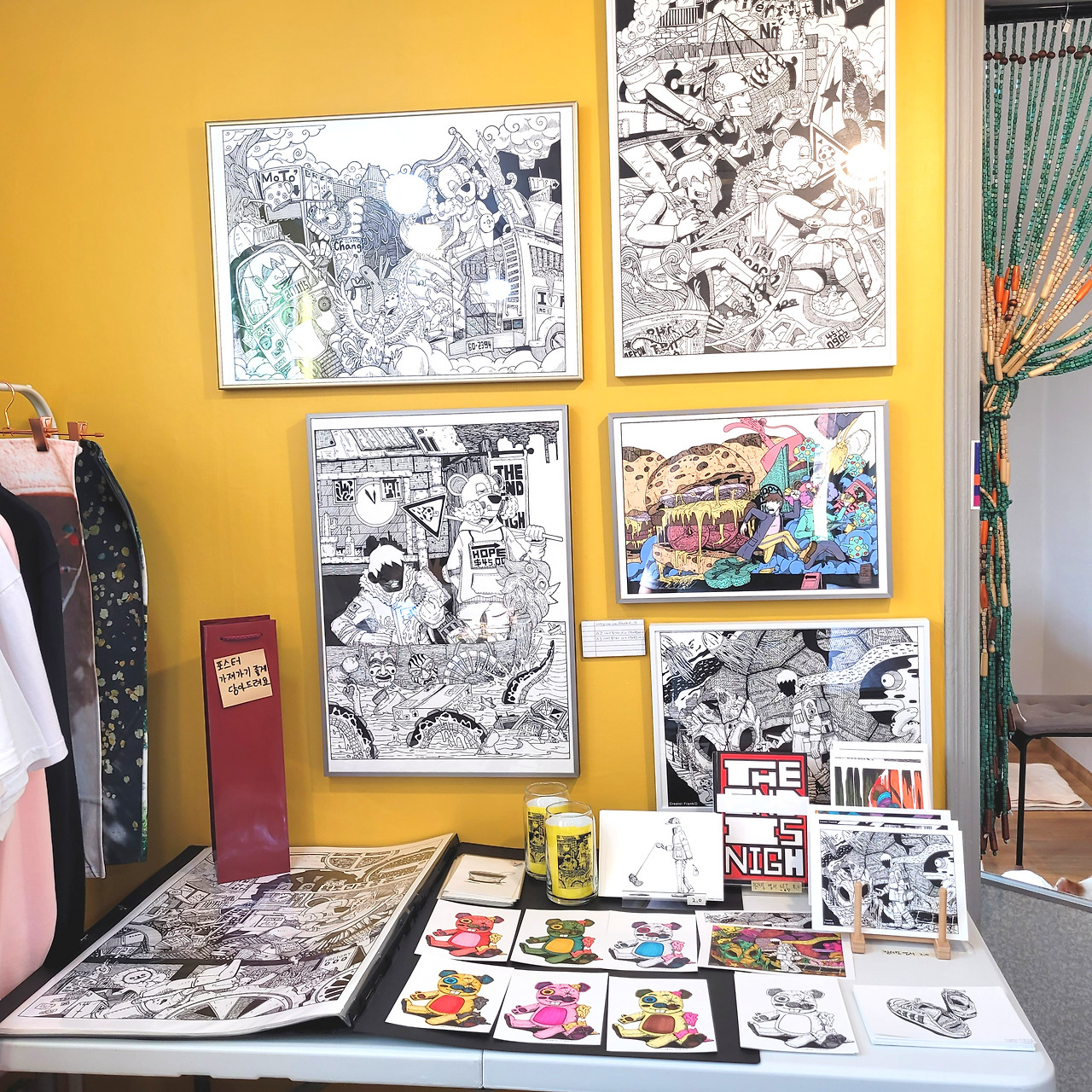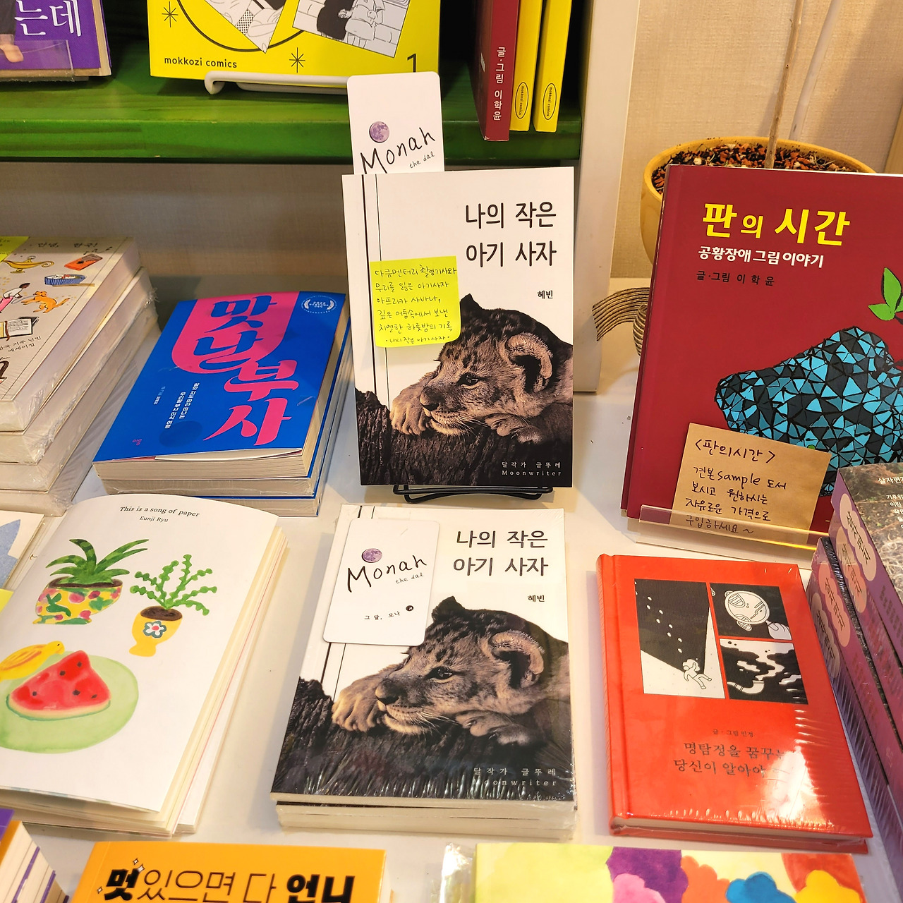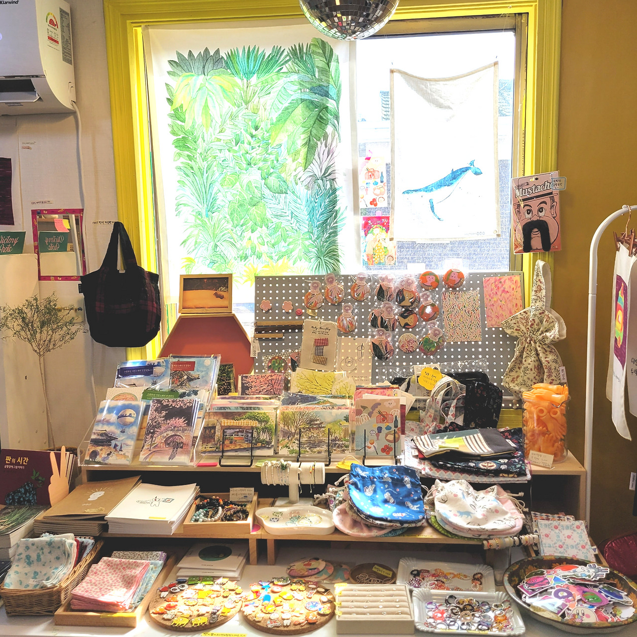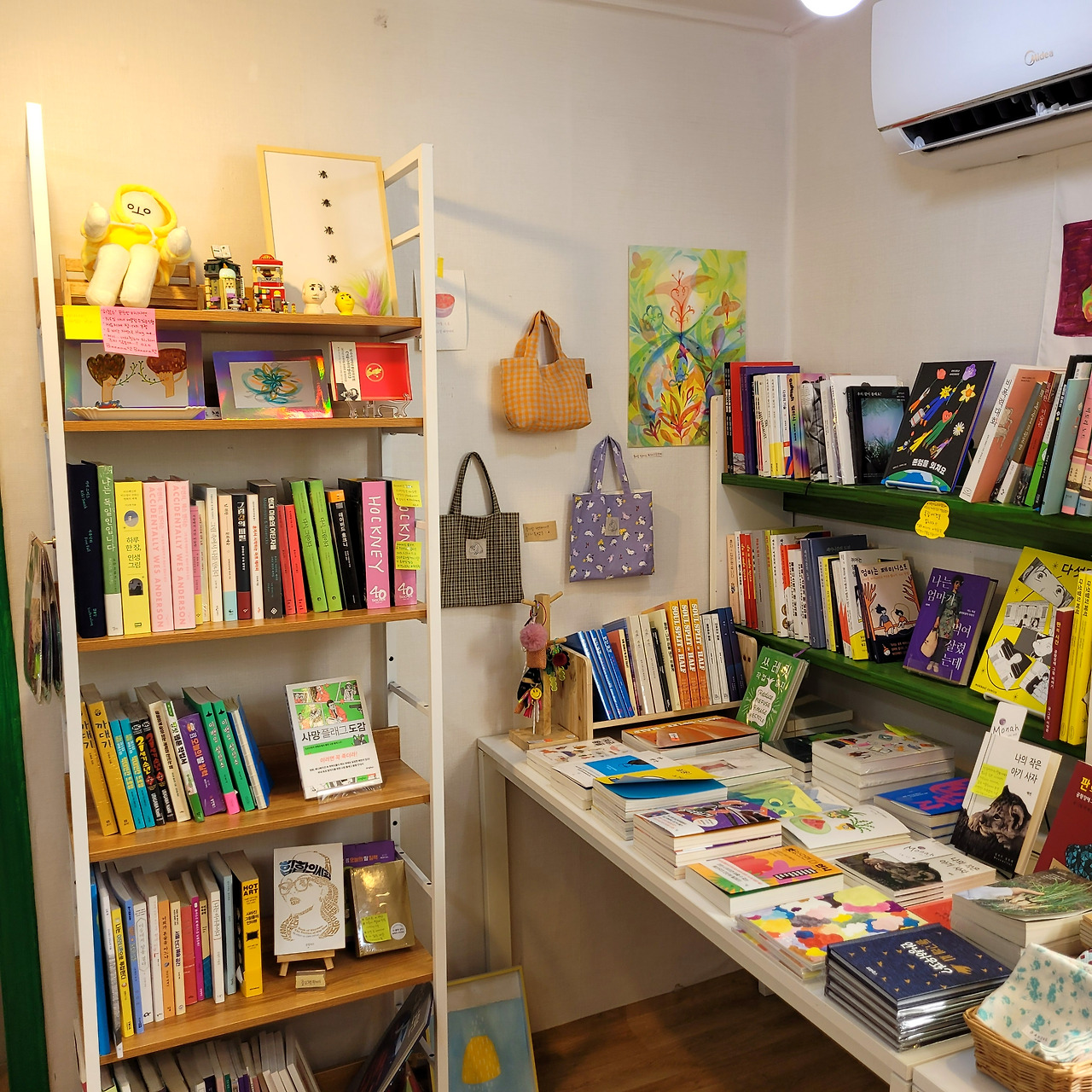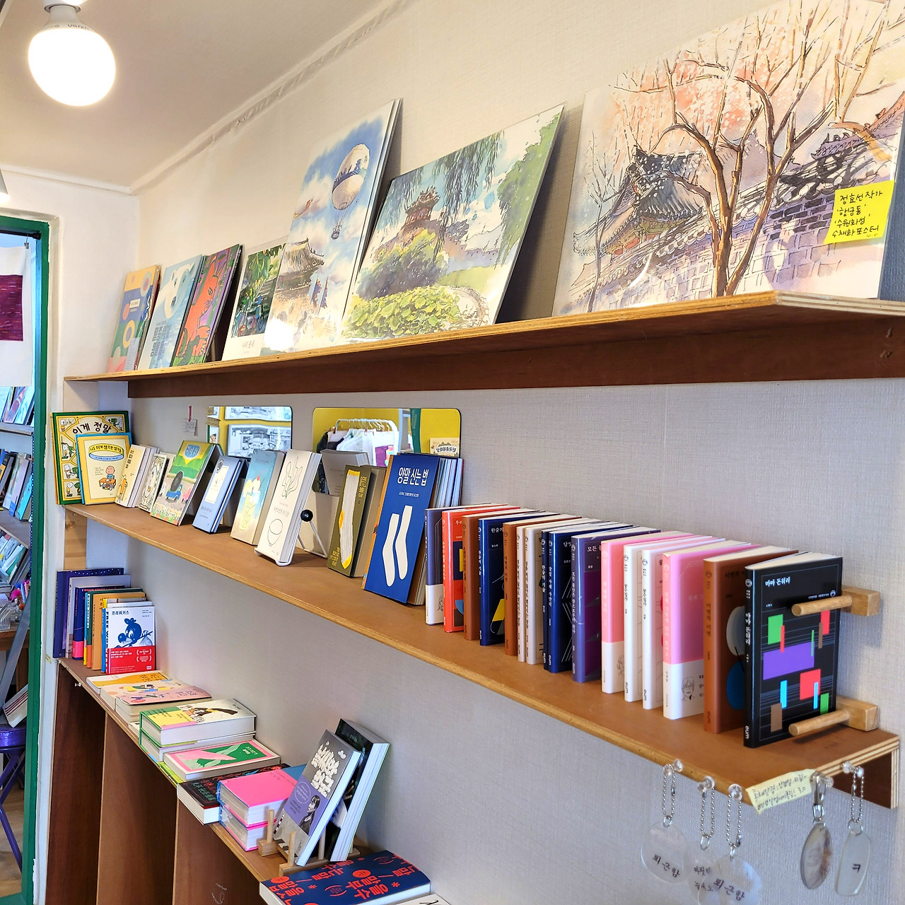 그렇다고 다른 곳에 놓인 책들에 눈이 가지 않았단 얘기는 아니다. 그러지 않을 수가 없다. 팩토리 공공공의 책들의 표지는 대부분 서점만큼 개성이 강하다. 특히 표지가 아름다운 그림책이 많아 겉면을 구경만 해도 눈이 즐겁다. 군데군데 유머러스한 제목들도 섞여 있어 표지만 감상해도 지루하지 않다. 그림책들 사이에는 진짜 그림도 섞여 있다. 전부 책방 인근에서 활동하는 예술가들의 작품들이다. 수채화와 일러스트, 패브릭 포스터와 수공예품들까지 종류도 다양했다. 몸을 돌릴 때마다 서로 다른 스타일의 작품들이 모습을 드러내 심심할 틈이 없다.