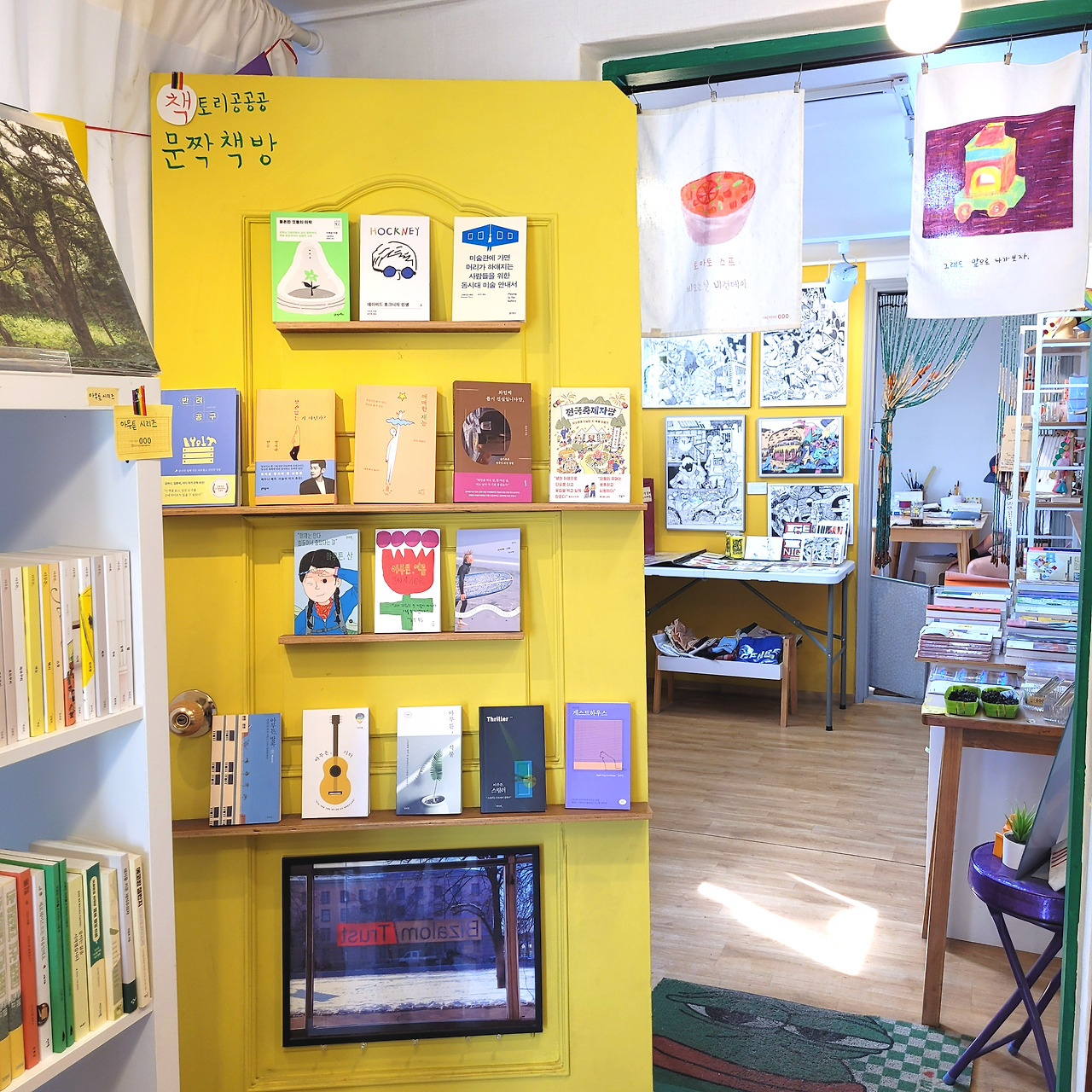 팩토리 공공공은 세 공간으로 나누어져 있다. 입구 근처에는 업사이클링 제품과 책들이, 중앙부는 다량의 소품과 다량의 책들이 진열되어 있으며, 마지막은 제일 중요한 책방의 사무실이다. 길다란 복도처럼 늘어선 공간은 한 걸음을 디딜 때마다 구경할 것들 투성이다. 그중에서 가장 눈에 띄는 건 아무래도 서점의 입구부터 존재감을 뽐내는 환한 노란색의 ‘문짝 책방’. 문자 그대로 ‘문짝을 뜯어서 만든 책장(혹은 작은 책방)’이다. 공간을 구분 짓던 문을 책장으로 재활용할 생각을 하다니, 심상치 않은 재간과 아이디어다. 심지어 문으로 만든 책장은 책을 진열하기에 꽤 유용했다. 책이 모두 전면을 보고 있으니 자연스레 그 위에 놓인 책들에 시선이 갔기 때문. 책이 아닌 그림을 감상하는 마음으로 표지와 제목을 훑어보게 된다.