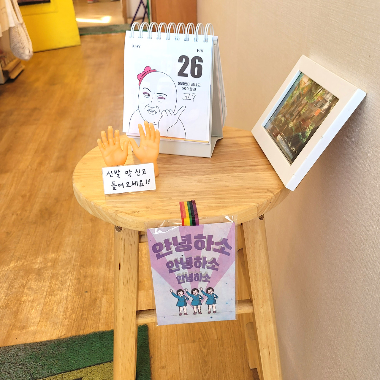 보폭을 넓혀 성큼성큼 계단을 오르다 보면, 귀여운 문구가 눈에 들어온다. ‘계단이 많아서 죄송합니다. :)’ 죄송할 거 하나 없는 일이지만, 그래도 머리를 긁적이는 해맑은 얼굴에 웃음이 난다. 가파른 계단에 당황스러웠던 마음도 눈 녹듯이 사라진다. 하지만 계단참의 문구는 서점의 매력을 알리는 신호탄에 불과하다. 팩토리 공공공에서 이 정도 익살은 간지럽지도 않다. 그만큼 서점은 공간 가득, 방문객 웃기기에 최선을 다하기 때문.
