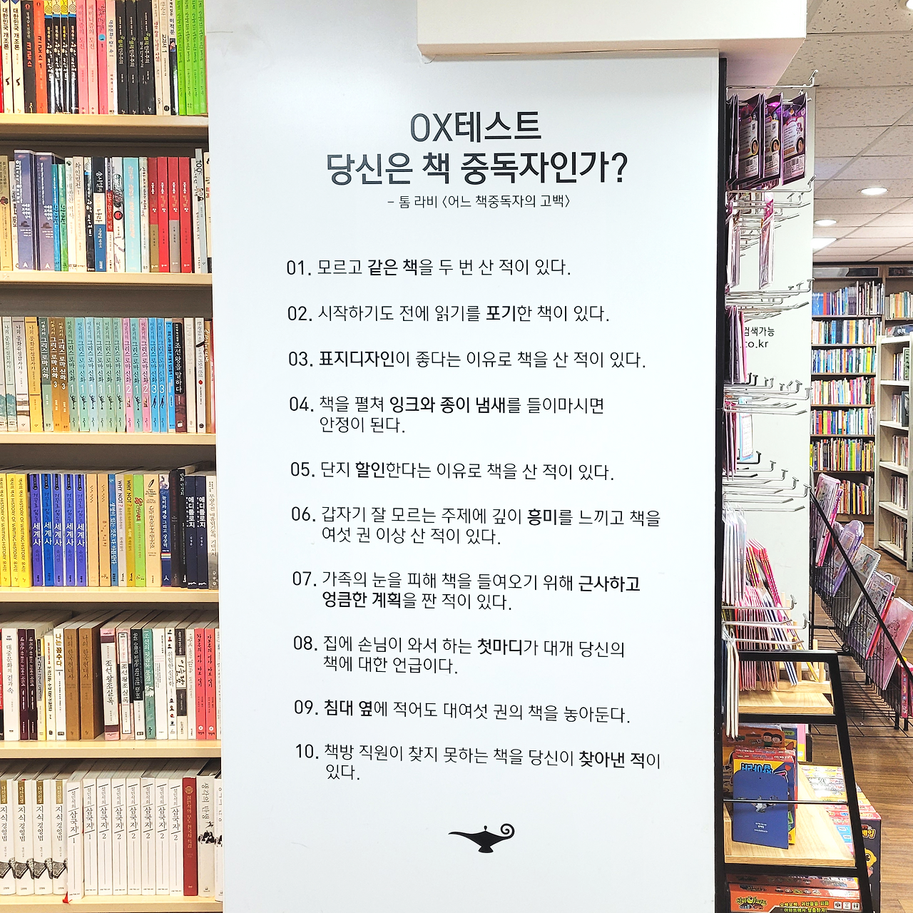 알라딘에서 책은 책방 내부를 가꾸는 콘텐츠로도 소비되었다. ‘책 읽는 개’만 입장 가능하다는 입구의 우스개소리부터. 품절 절판 도서의 긴 코너 이름인 ‘광활한 우주에서 이미 사라진 책을 읽는다는 것’. 그리고 서점 중앙 벽면에 커다랗게 붙어 있는 ‘책 중독자 테스트’까지. 알라딘에서 책은 판매해야 하는 물질로서의 상품, 그 이상이었다. 책은 공간을 꾸미는 콘텐츠, 함께 읽고 즐길 수 있는 인테리어가 되어 공간에 재미를 더하고 있었다.