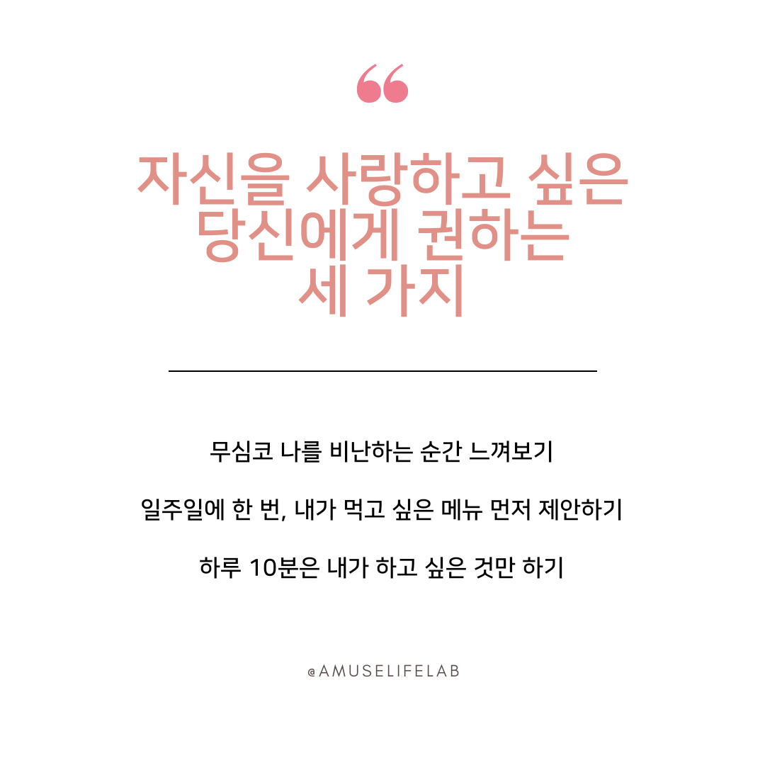여기까지, 제가 제안하는 '나를 사랑하는 방법 세 가지'였어요. 이 글을 읽고 계시는 여러분은 어떤 방법이 또 떠오르시나요? 생각나는 방법도 공유해주시면 다른 분들께도 도움이 될 거예요 :)