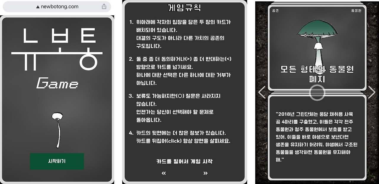 <뉴보통 게임>은 ‘모두가 공존할 수 있는 미래를 구축하는 방법’에 대해 관객이 직접 고민하게 만드는 게임형식의 작품이에요. 기후위기 관련 카드들을 보고 자신이 추구하는 가치를 선택한 후, 2채널 플레이 영상을 통해 그 선택에 대한 결과를 체감할 수 있죠. 이러한 과정을 통해 남의 일, 먼 이야기라고만 생각했던 기후위기에 대해, 특히 기후위기 시대에 우리가 지켜야 할 가치에 대해 보다 능동적으로 고민하는 시간을 선사하였죠.