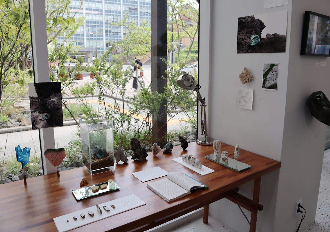 이 프로젝트를 하기 전에 공간 연출하는 일을 했었어요. 그래서인지 공간과의 호흡을 굉장히 중요하게 생각해요. 그 공간에서의 호흡과 맥락에 따라 사람들이 느끼는 몰입도가 바뀌기 때문에 공간이 가지는 분위기나 뉘앙스에 맞추는 걸 가장 우선적으로 생각해요. 그래야 누구든 잘 볼 거라고 생각 하는 것이죠. 보틀 팩토리라는 제로 웨이스트 카페에서는 사람들이 뉴 락을 다 만져볼 수 있게 했거든요. 왜냐하면 한 번 들어보면 진짜 느낌이 다른데, 환경에 관심이 많은 사람이 주로 찾는 그 공간에서는 진행이 가능하겠다는 생각이 들었거든요. 지금 전시 중인 명동의 온드림 소사이어티 공간에서도 더 감각적이고 직관적으로 자극을 주기 위해 사람들의 흐름과 바깥 풍경 등을 고려하여 전시를 구성하였죠.
