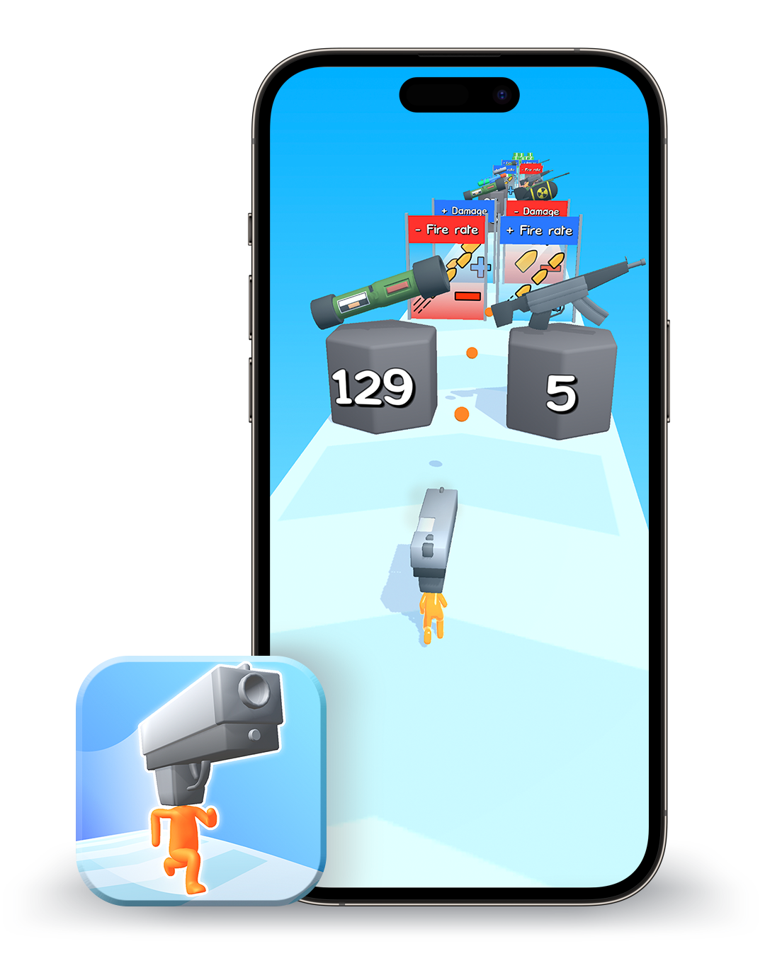 두 번째로 높은 다운로드를 기록한 건헤드런은 작년 6월 출시한 러너게임입니다. 하이퍼캐주얼 게임에서 주로 사용되는 '젤리맨'에게, 머리 대신 총이 달린 캐릭터가 달리면서 총알을 발사하는 컨셉의 게임이에요. 총이 장애물을 피해 달리며 다양한 종류의 총과 탄피를 습득하고, 장애물에 부딪히면 스테이지가 종료돼요. 좌우로 달리는 방향만 조절하면 되기에 조작이 간편하고, 직관적으로 플레이가 가능하여 꾸준히 사랑받고 있는 게임이죠.