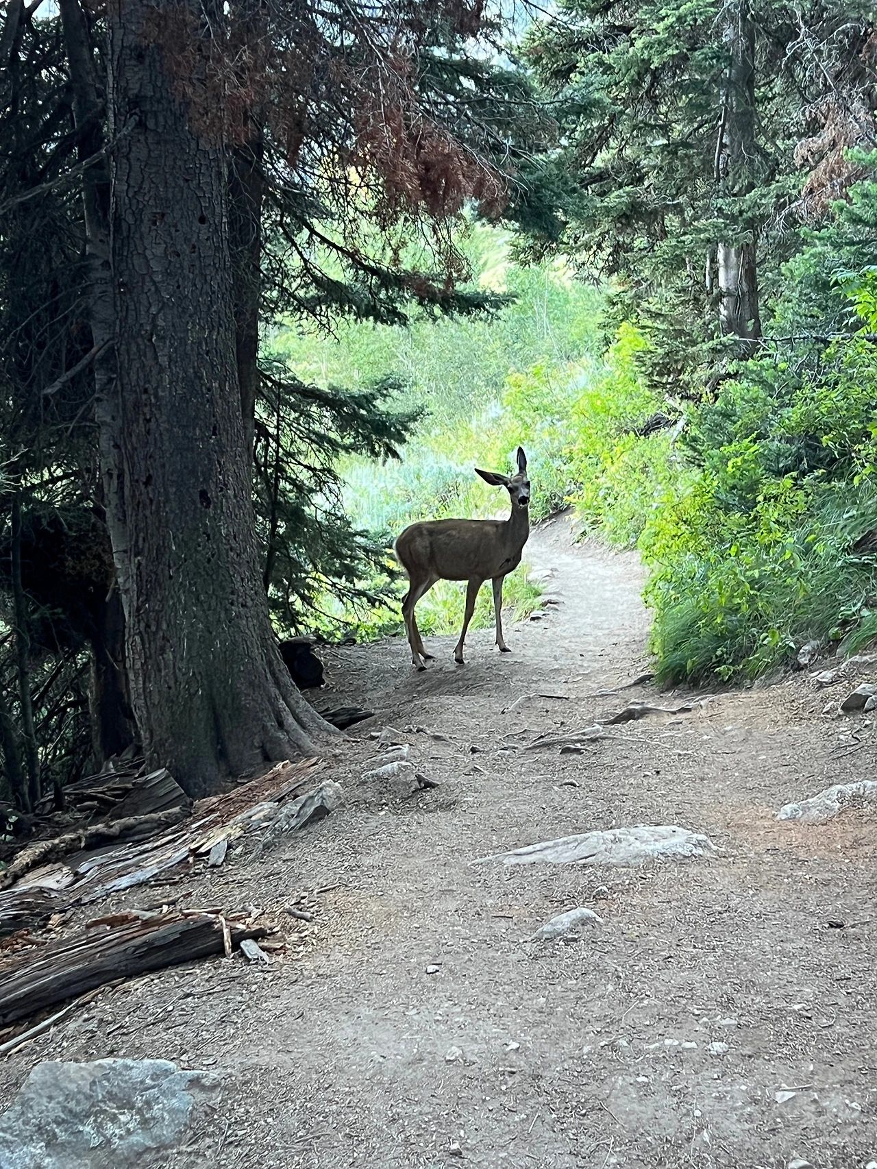 그런데 이번에는 엄마 사슴이랑 새끼 사슴이 길 위에 떡하니 서있는 게 아닌가. 둘은 달아나지도 않고 미동도 없이 길 위에서 우리를 빤히 봤다. 그러다 새끼 사슴은 풀 속으로 들어가고 엄마사슴만 남아 우리를 빤히 바라봤다.