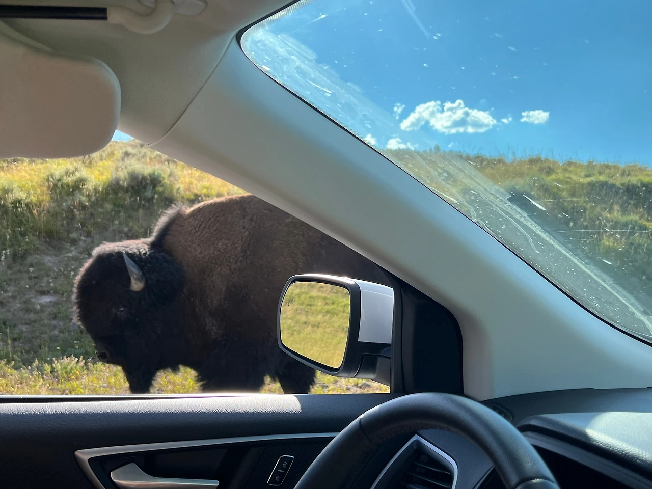 우리 앞차 앞으로 거대한 바이슨이 길을 건넜다.