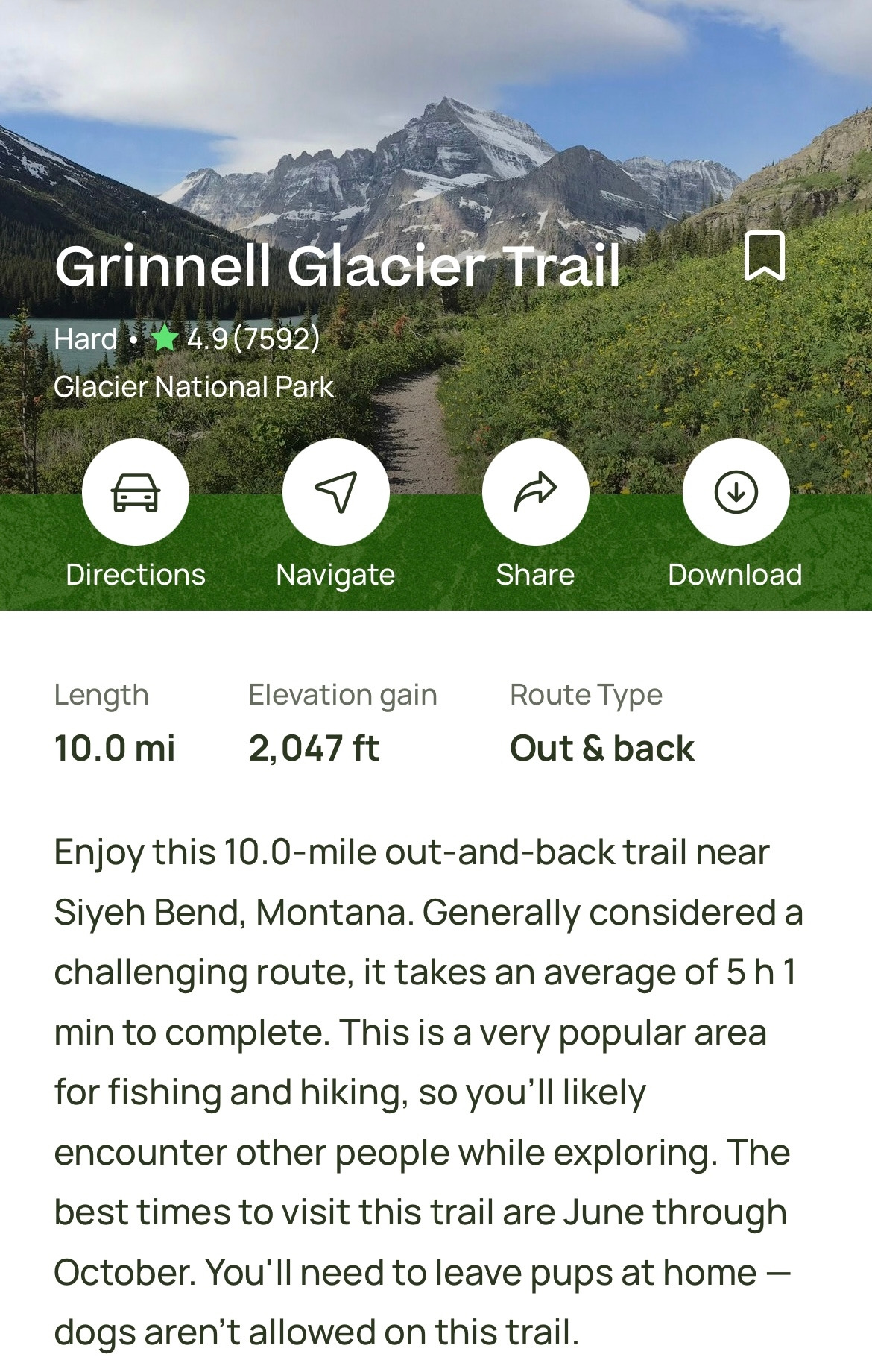 8시 반 드디어 차에 올라탔다. 11시 정도에 도착해서 여유 있게 하이킹을 하고 싶었다. 왕복 16킬로미터인 그리넬 트레일을 하이킹하는 데 걸리는 시간은 5시간 정도다. 그런데 경치 좋은 곳에서 간식도 먹고 사진도 찍고 천천히 올라가고 싶었다. 그리고 정상에서 머무는 시간을 40분 정도라고 잡아서 왕복 하이킹 시간을 7시간으로 잡았다. 해가 지면 곰이 나올 수 있으니 6시에 차가 있는 곳으로 내려오는 것이 목표였다.