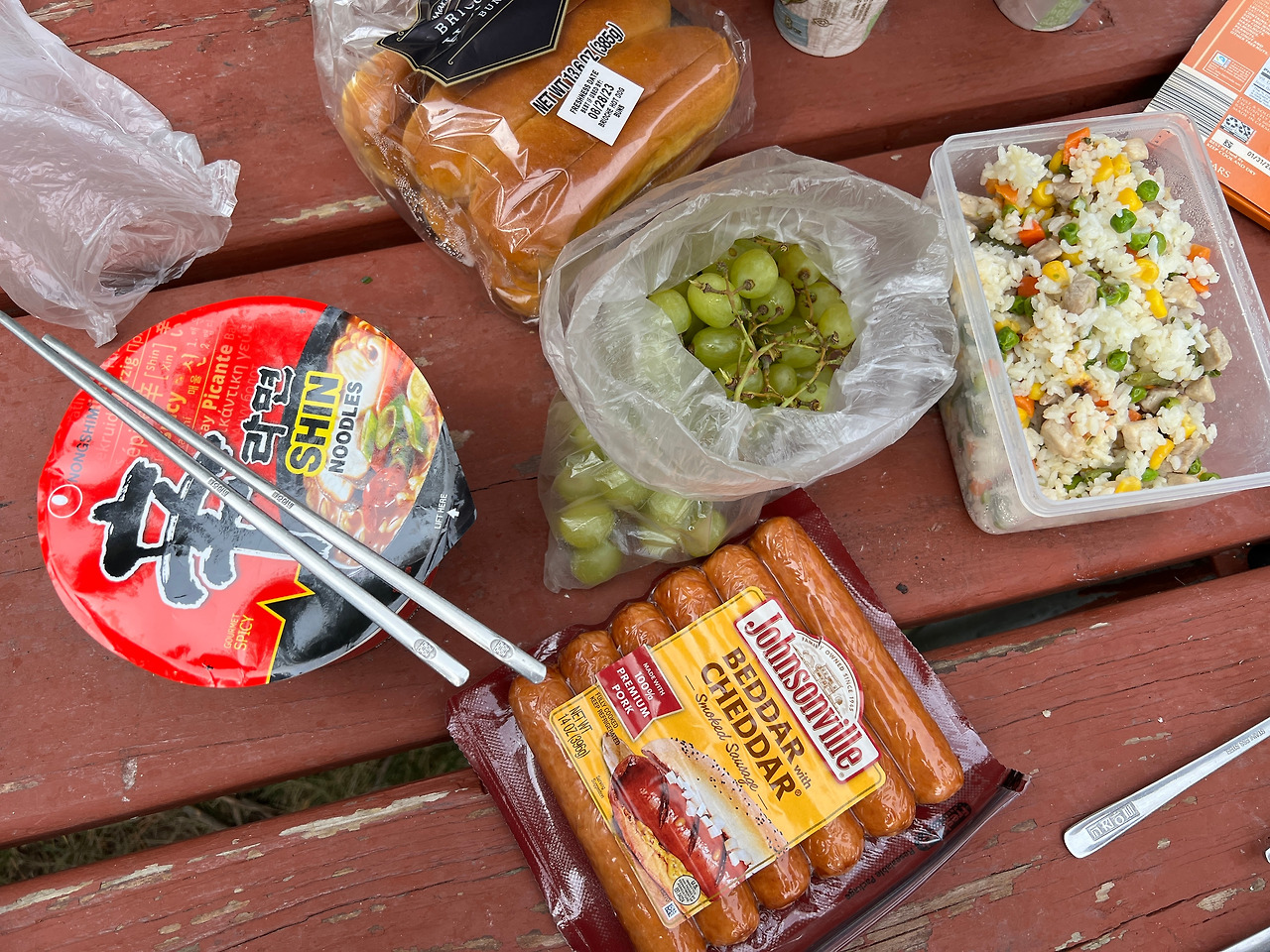 우리 가족이 트레일 헤드에 도착하니 11시 반이었다. 고잉 투 더 썬 로드에서 몇 번 주차를 하고 경치를 보느라 시간이 더 걸렸다. 마침 점심시간이라 그린넬 글래이셔 트레일 헤드 피크닉 장소에서 가지고 온 볶음밥도 먹고 보온병에 넣어 온 뜨거운 물을 부어 컵라면도 먹었다.