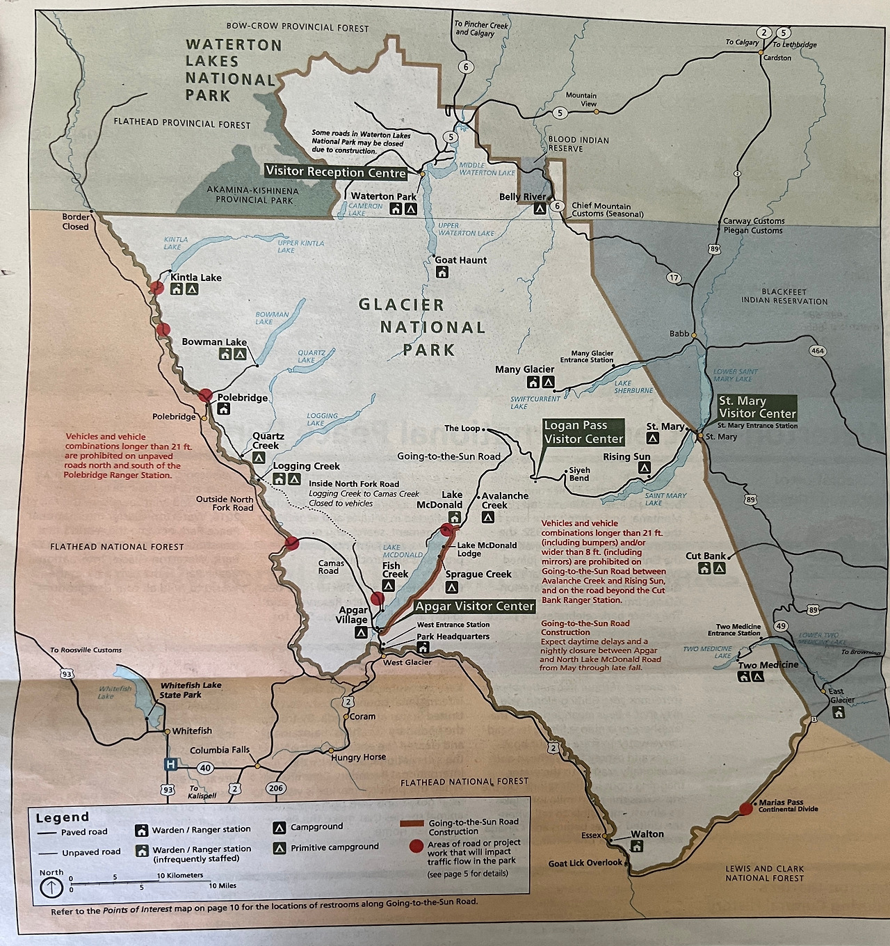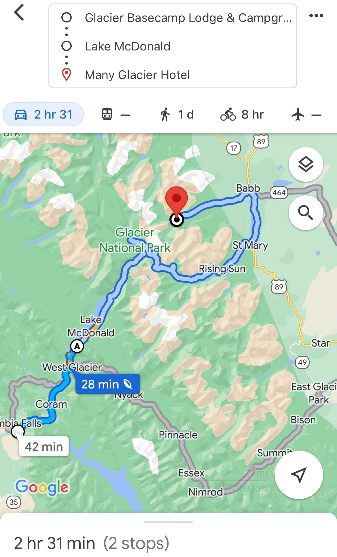 트레일 헤드인 매니 글래시어까지 가는 데 걸리는 시간은 2시간 반. 고잉 투 더 썬 로드를 통과하지 않고 국립공원 밖으로 돌아가는 길이 거리는 더 멀지만 시간은 덜 걸린다. 하지만 드라이브를 하며 보는 경치를