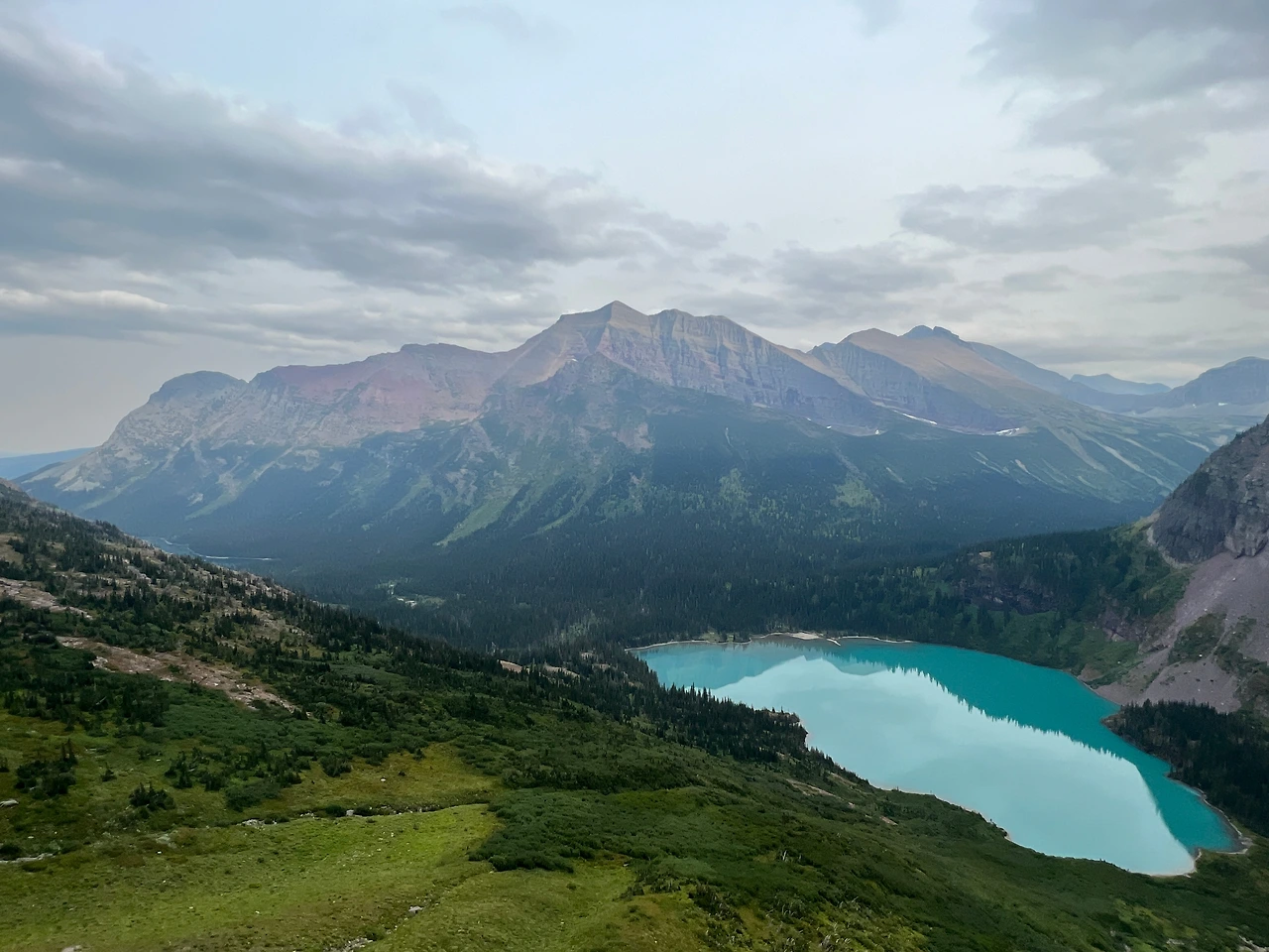 마지막 경사를 오르자 불투명한 에메랄드빛 호수가 멀찍이 보였다.