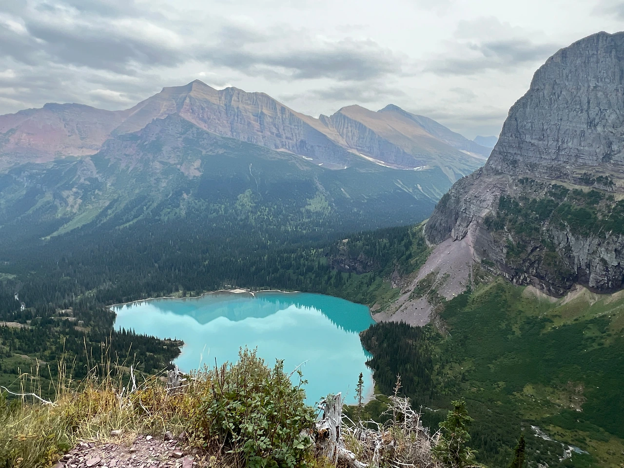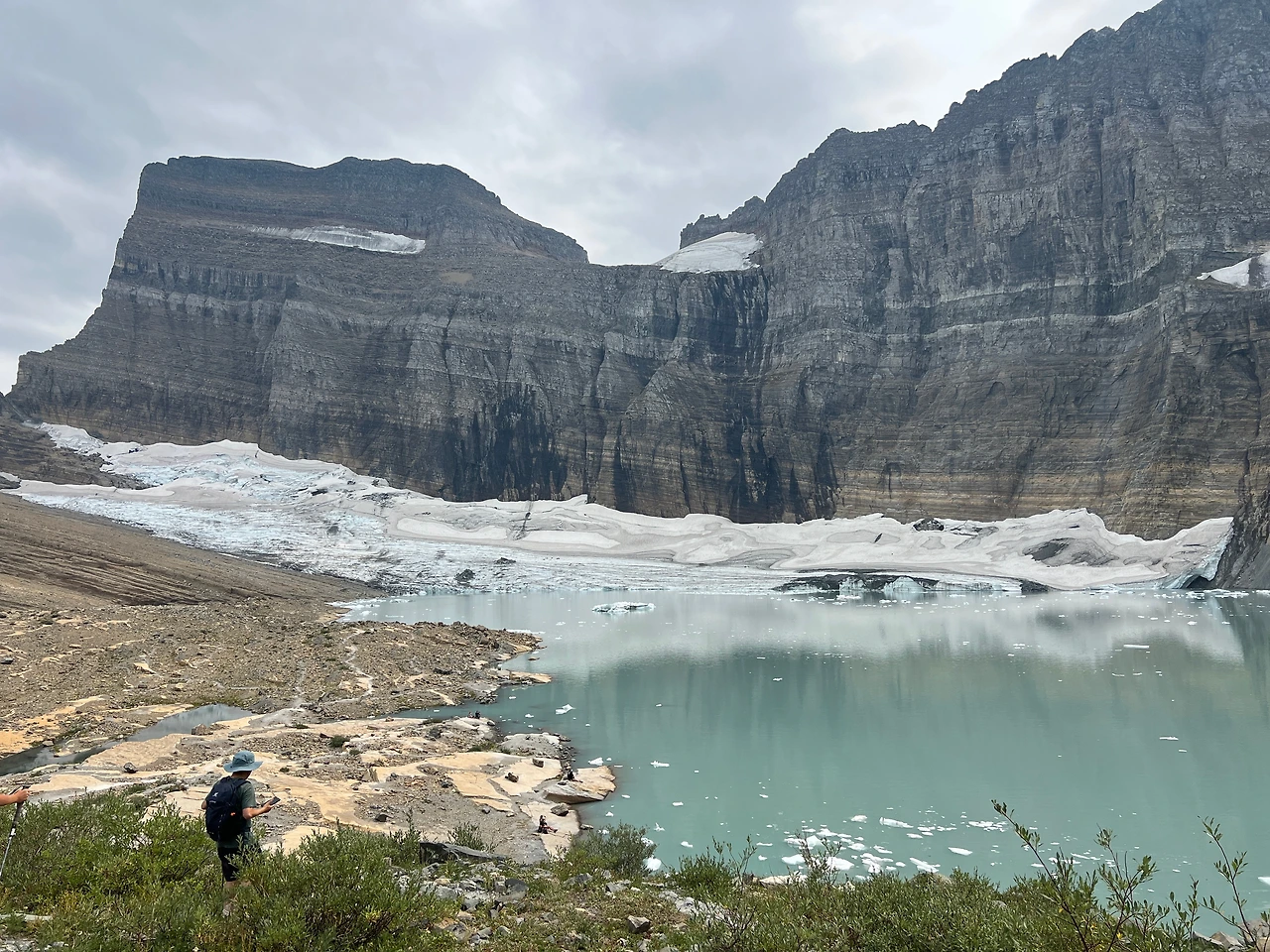 멀리서 봤을 때 에메랄드 색이었던 그리넬 글래시어 호수는 탁한 회색빛이 섞인 에메랄드 색이었고 죽은 곤충도 둥둥 떠다녔다. 글래시어에 오르면 또다시 몸을 담가보려고 했는데, 어쩐지 수영하는 사람이 안 보이더라니.