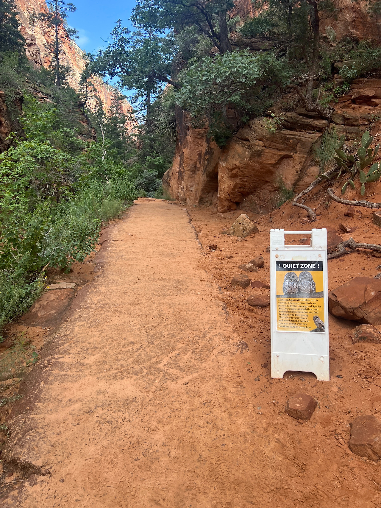 첫 번째 스위치백까지는 아침에는 그늘이 없어 고스란히 해를 받으며 걸어야 했다. 붉은 바위도 색을 잃게 만드는 뜨거운 해였다. 공기도 건조해서 해는 여과 없이 눈과 피부를 찔러댔다. '아침 9시 이전에 산을 올랐어야 했나.' 생각이 들 만큼 뜨거웠다. 그래도 이 구간을 지나니 양쪽이 절벽으로 둘러싸인 그늘이 나왔다. 여기는 야생 부엉이가 사는 곳이라 조용히 걸으라는 안내판이 세워져 있었다. 목소리 낮추고 걷다 보니 시원한 바람도 한 줄기 불었다.