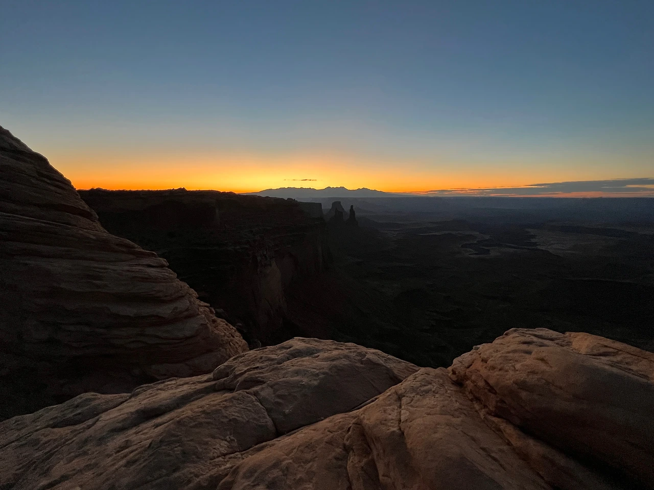 명당자리가 아닌 덕분에 메사 아치 뒤로 낮게 펼쳐진 캐년이 한눈에 보이는 자리에서도 메사 아치 앞에 우뚝 서 있는 바위 위에서도 아치와 뜨는 해를 감상할 수 있었다.