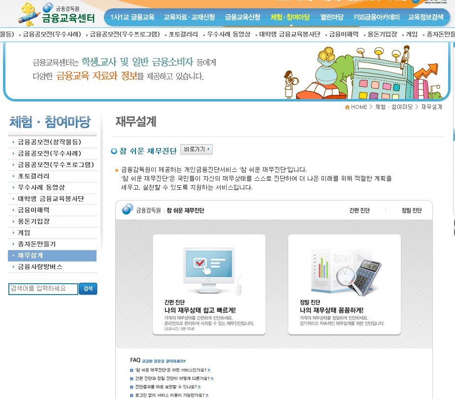 13~29개의 문항을 통해 소득과 지출등을 잘 모르는 분도 5분 내에 손쉽게 재무진단이 가능한 ‘간편진단’과 소득,지출,부채,지출 등 본인의 재무현황을 구체적으로 입력하여 알 수 있는 ‘정밀진단’이 가능합니다.