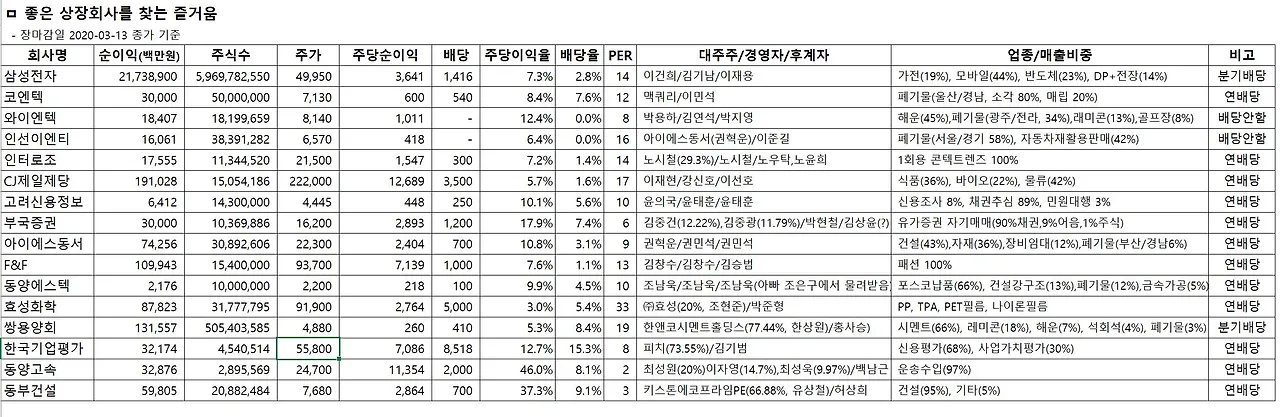 2020년 3월 13일 주식 가격 기준입니다. 주식수는 총 발행 수, 순이익은 잠정 발표 기준입니다. 다른 정보들은 3분기 분기보고서를 기준으로 작성했습니다.