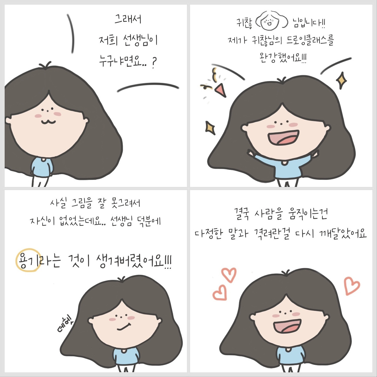 결국 난 2주일여만에 완강을 하게 된다. 완강한 것 자체만으로도 뿌듯함이 최고조였다. 생전 처음 들어보는 그림 강의를 완강하다니. 그리고 심지어 무언가를 혼자 그릴 수 있게 되다니. 감동이었다. 다 선생님덕분이다. 그래서 귀찮 선생님께 드리는 헌정사를 그림으로 그렸다.