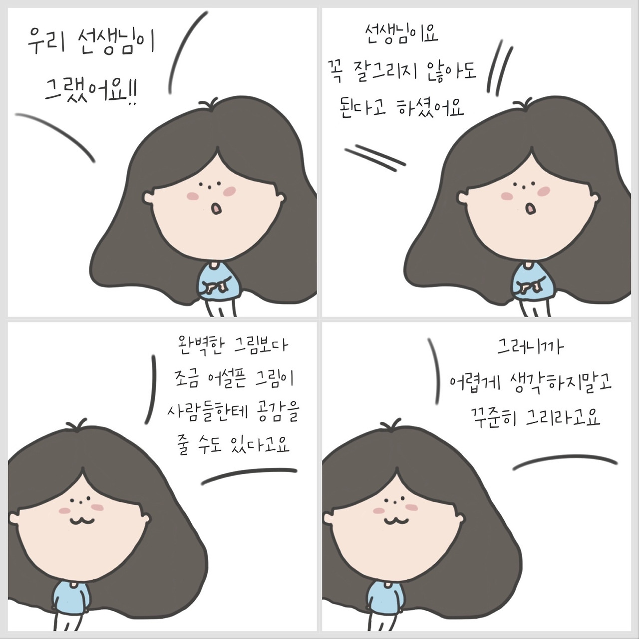 선생님은 수업을 하시는 과정에서 계속 수강생들에게 용기를 불어넣어주려고 하셨다. "잘 그리지 않아도 괜찮아요" "완성도보다 콘텐츠가 더 중요해요" "잘 따라오고 있어요" 끊임없이 말씀해주셨다. 강의가 계속되면서 기죽으려고 할때마다 다정한 멘트를 툭툭 던져주시는데 그 마음이 따뜻해서 수업을 따라갈 수 밖에 없었다.