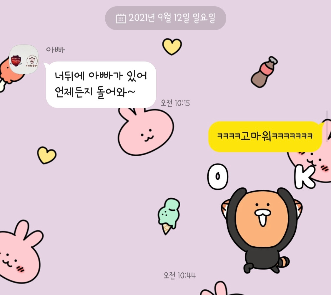 결혼 전에 "넌 이제 출가외인이야."하며 장난스레 선을 긋던 아빠의 태도와 사뭇 달랐다. 갑작스러운 다정한 메세지에 당황스럽기도 했지만 그 메세지에 마음이 한껏 든든해졌다. '결혼 생활이 힘들면 꼭 참지 않아도 되는구나. 아빠가 돌아와도 된다고 했어.'하며 앞으로의 삶이 두렵지만은 않았고 그런 메세지를 보내준 아빠한테 너무 감사했었다.