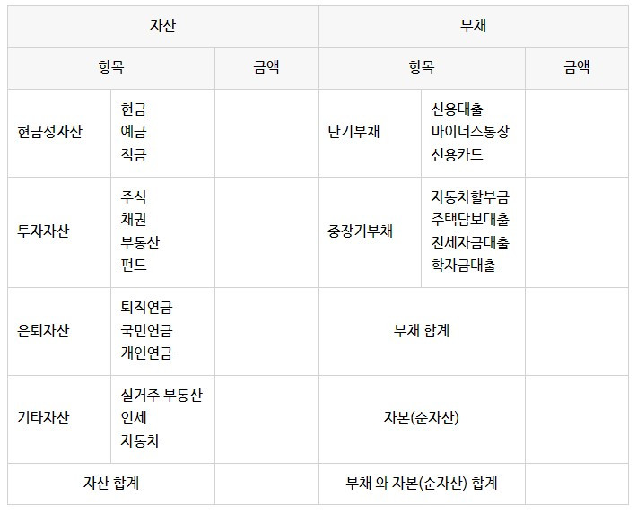 재무상태표를 작성하는 방법은 우선 T자형 표를 그립니다. 왼쪽에는 자산 항목을 적고 오른쪽에는 부채 항목을 적고 부채 아래에는 자본(순자산) 항목을 적습니다.