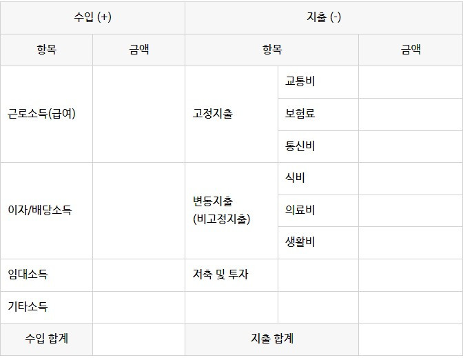 보통 한 달(일정 기간)에 현금이 들어오고 나가는 것을 나타내는 표이다. 개인의 수입과 지출 그리고 저축 및 투자의 항목으로 나타낸다.