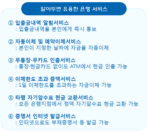 '입출금내역 알림서비스'는 고객의 계좌에서 입출금거래가 있으면 그 내역을 즉시 해당 고객에게 알려주는 서비스로, 은행에서 신청하면 된다. 단, 이 서비스는 휴대폰 문자 전송방식으로 제공되기 때문에 소정의 수수료를 부담할 수 있다. 또한, 은행은 계좌 비밀번호 변경, 통장 분실재발급 등 주요 거래가 발생할 경우에도 은행에 등록된 고객의 휴대폰 번호로 이를 통지해주는 서비스를 제공하고 있다. 따라서, 본인의 휴대폰 번호가 변경될 경우에는 은행에도 변경 사실을 알려야 한다.