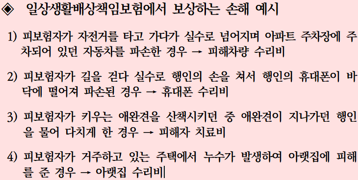 일상생활배상책임보험은 보험가입자가 다른 사람에게 인명, 재산상의 피해를 입혔을 때 생기는 법률상 배상책임에 따른 손해를 보상하는 보험이다. 비교적 적은 보험료(통상 1000원 이하)로 일상생활 중 발생할 수 있는 다양한 배상책임을 보장받을 수 있기에 유익하게 활용할 수 있다. 피보험자의 범위에 따라서 ▲일상생활배상책임보험 ▲가족일상생활배상책임보험 ▲자녀일상생활배상책임보험으로 나뉜다. 통상 손해보험사의 어린이보험, 주택화재보험, 상해보험 등 특약형태로 판매되고 있다. 상품 가입 여부는 금융소비자 정보포털 사이트인 '파인'에서 확인 가능하다. 이제 일상생활책임보상보험에 대해서 알아보자.