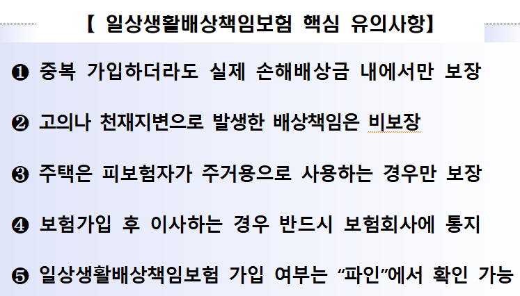 따라서 일상생활배상책임보험에 가입하였다면 이사 후에는 반드시 보험회사에 이사사실을 알리고 보험증권에 기재된 주택을 변경할 필요가 있습니다.
