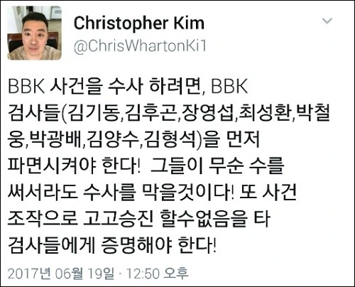 김경준 씨는 올해 6월 BBK 사건에 대한 검찰의 문제점을 트위터와 언론에 밝힙니다. 그는 BBK를 수사하려면 당시 BBK 수사검사였던 김기동, 김후곤, 장영섭, 최성환, 박철웅, 박광배, 김양수, 김형석 검사 등을 파면해야 한다고 주장하죠. 이들이 무슨 수를 써서라도 BBK 수사를 막으려 할 것이라는 게 그 이유였죠.