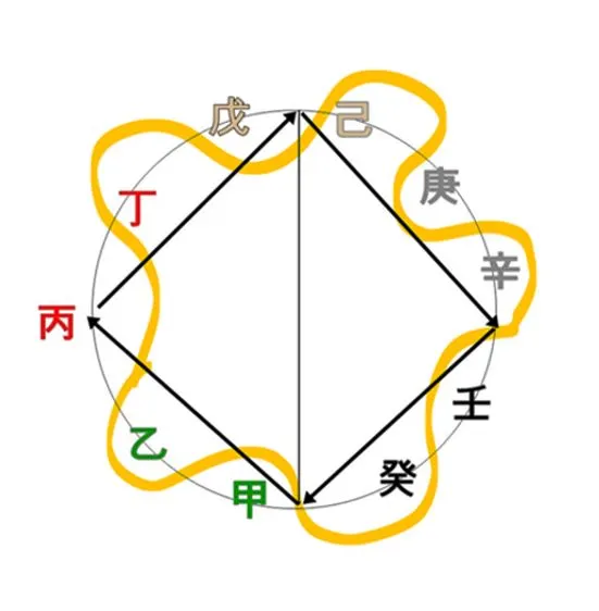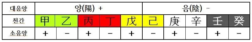 대음양 상에서 목화는 양이고 금수는 음이라고 하였다. 따라서 10천간 중 갑을병정무를 대음양 상의 양이라 분류하고 기경신임계를 대음양 상의 음이라 분류한다.