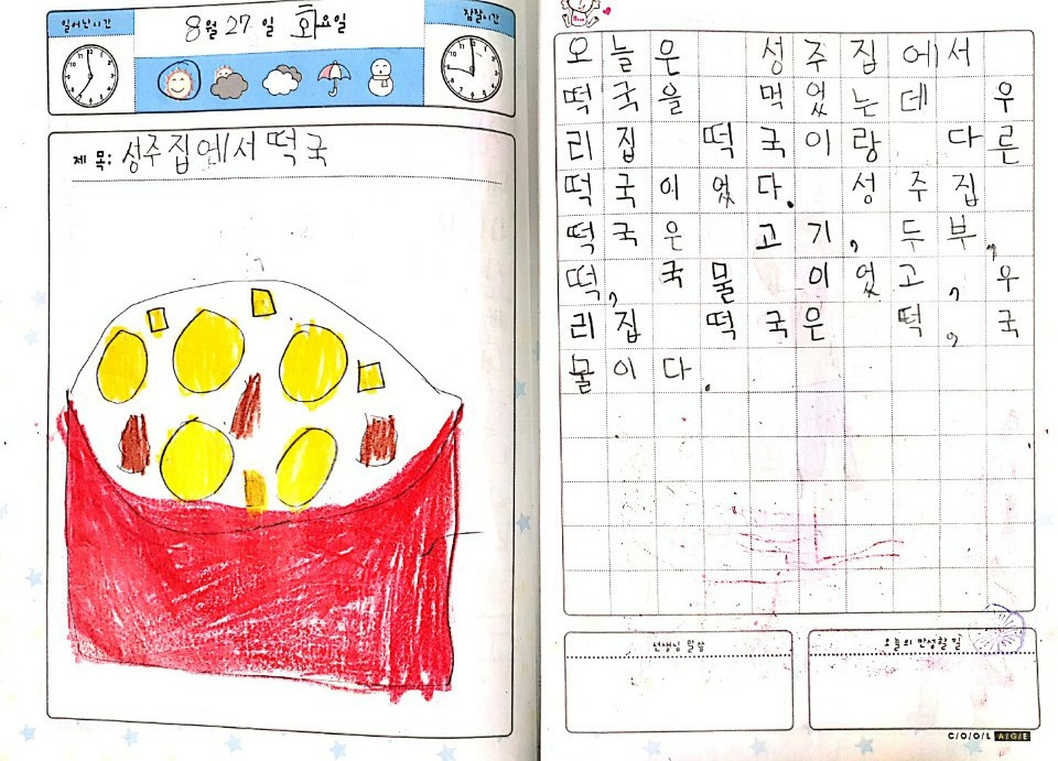 아이들을 잘 먹여야 한다는 강박은 큰 아이가 초등학교 1학년 때 썼던 일기에서 시작한다. 친구 집에 놀러 갔다 얻어먹은 떡국 이야기다. 친구 집 엄마가 끓여 준 떡국을 보고 이런 글을 쓰다니... 다양한 재료를 나열하며 친구 집 떡국이 우리 집 떡국과 다름을 설명하더니, 마지막 문장으로 엄마에게 한 방을 크게 날려버렸다.