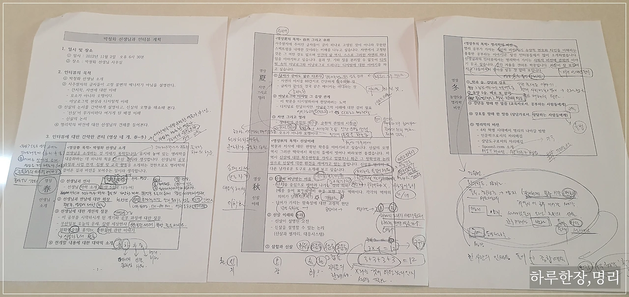 그때부터 <춘하추동 신사주학> 네 권의 책을 읽으면서, 여러 군데 밑줄을 긋고 라벨을 붙여가며 꼼꼼하게 공부를 했습니다. 책을 다 읽고 선생님과 소통할 자신감이 생긴 이후에 인터뷰의 콘티를 제작하였습니다. 나름 진지하게 고민하고 꼼꼼하게 작성하여 선생님께 메일을 보내드리고 인터뷰를 요청드렸습니다. 그런데 선생님께서는 사전 회의를 요청해 오셨습니다.