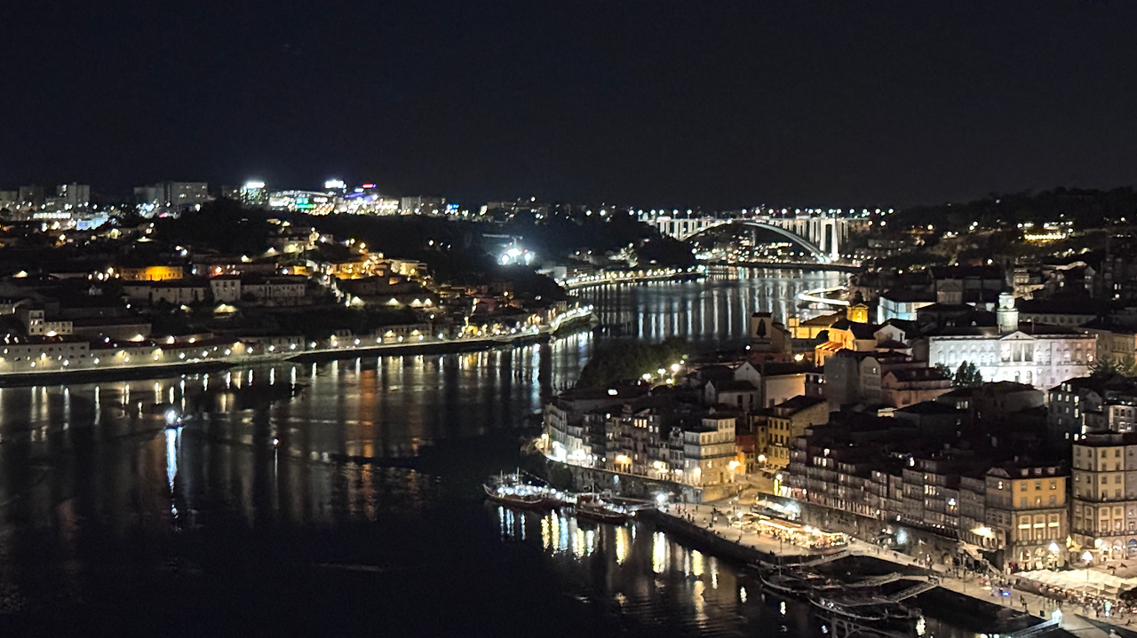 전망대에 오르자 시야는 확 트였다. S자로 흐르는 도우루강, 그 위를 가로지르는 다리들, 그리고 도시를 감싸는 불빛. 멀리서 아라이브 다리의 아치가 우아한 곡선을 그리며 모습을 드러냈다. 1963년 완공 당시 세계에서 가장 긴 아치 경간을 자랑했던 콘크리트 다리, 지금도 포르토의 상징 같은 존재다. 강 좌우로는 포르토 와인 양조장과 히베이라 광장의 고풍스러운 건물들이 자리하여, 서울 한강변 다리와는 전혀 다른 풍경을 보여준다. 서울의 다리가 세련됨을 강조한다면, 도우루강은 낮은 건물과 오래된 풍경이 주는 여백의 아름다움으로 시선을 붙잡는다.