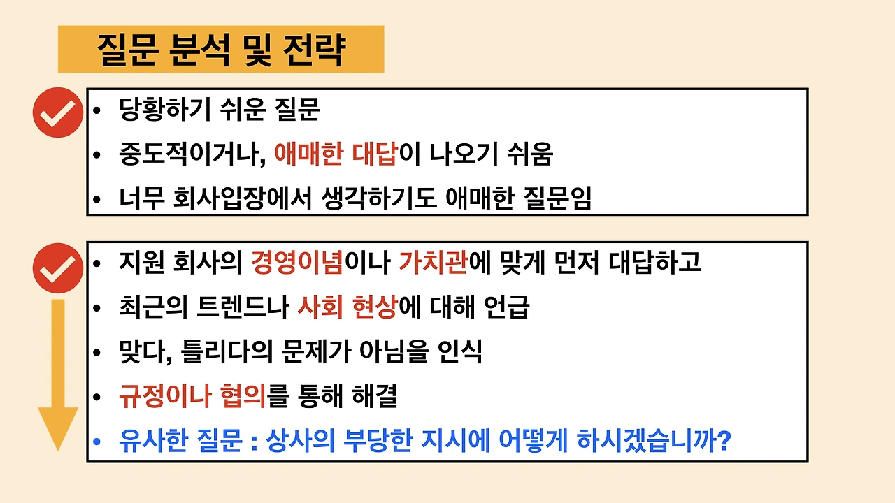 면접자도 마찬가지다. 회사의 입장에 서서 '틀린 행동입니다.'라고 이야기 하기에는 현재 사회적 분위기나 젊은 세대 감성에 너무 거스르는 것 같다. 그렇다고 '맞는 행동입니다.'라고 대답하기에는 면접자의 입장으로 회사에 분명한 손해가 되는 주장을 하기가 쉽지 않다.