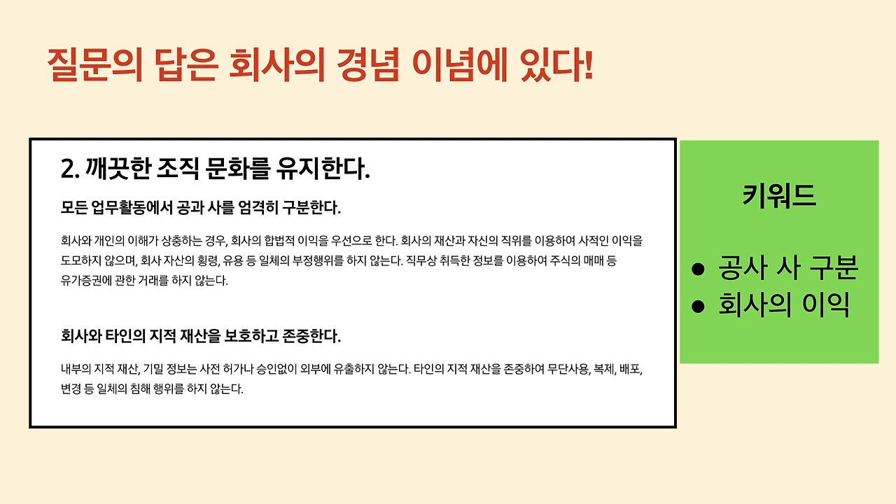 삼성전자의 경영이념을 찾아보도록 하자. 그중 키워드를 '공과 사의 구분', '회사의 이익'으로 가져와 이야기를 구성해보도록 하려고 한다. 여기에 요즘 사회적인 분위기에 해당하는 '본인의 경험'을 추가하게 되면 좀 더 풍성한 스토리를 구성해 나갈 수 있다.