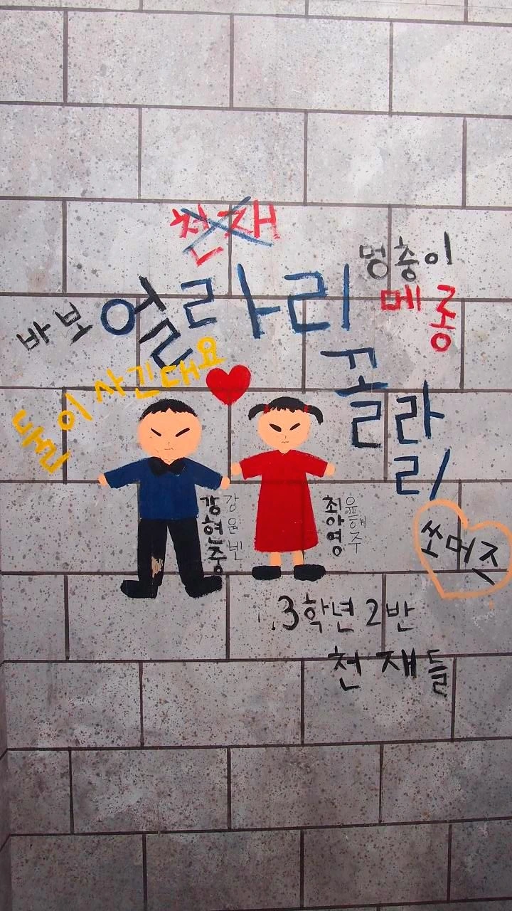 어느 순간부터 우리나라 관광지에 붐이 일기 시작한 벽화도 빠지지 않고 있었다. 이곳의 콘셉트는 ‘어린 날의 추억’인가 보다. 어릴 때 한 번쯤은 해봤을 벽에 낙서하기, 그중 “누구랑 누구랑 얼레리 꼴레리래요~”라는 아주 익숙한 말이 귓가를 맴돌았다. 부르지 않아도 느껴지는 그 멜로디로. 잠시 추억 속으로의 여행을 한다.