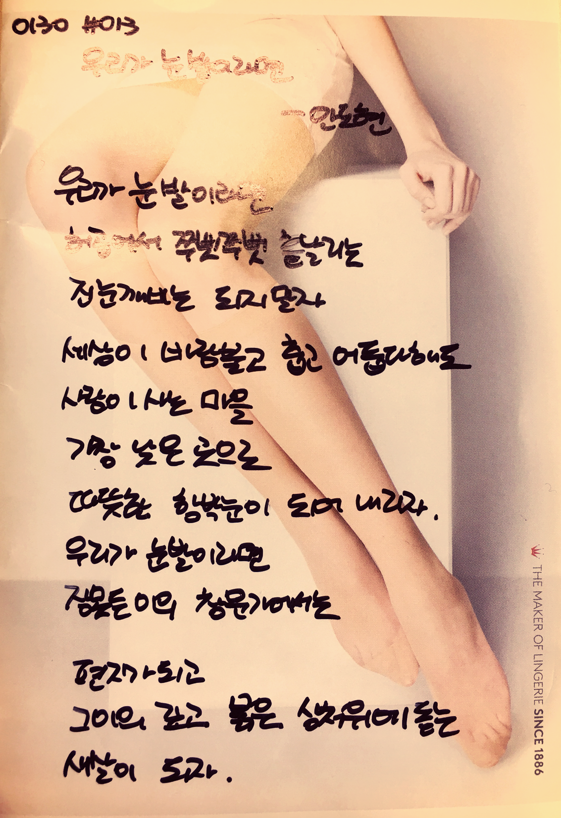우리가 눈발이라면 by안도현우리가 눈발이라면허공에서 쭈빗쭈빗 흩날리는진눈깨비는 되지 말자.세상이 바람 불고 춥고 어둡다 해도사람이 사는 마을가장 낮은 곳으로따뜻한 함박눈이 되어 내리자.우리가 눈발이라면잠 못 든 이의 창문가에서는 편지가 되고그이의 깊고 붉은 상처 위에 돋는새 살이 되자.