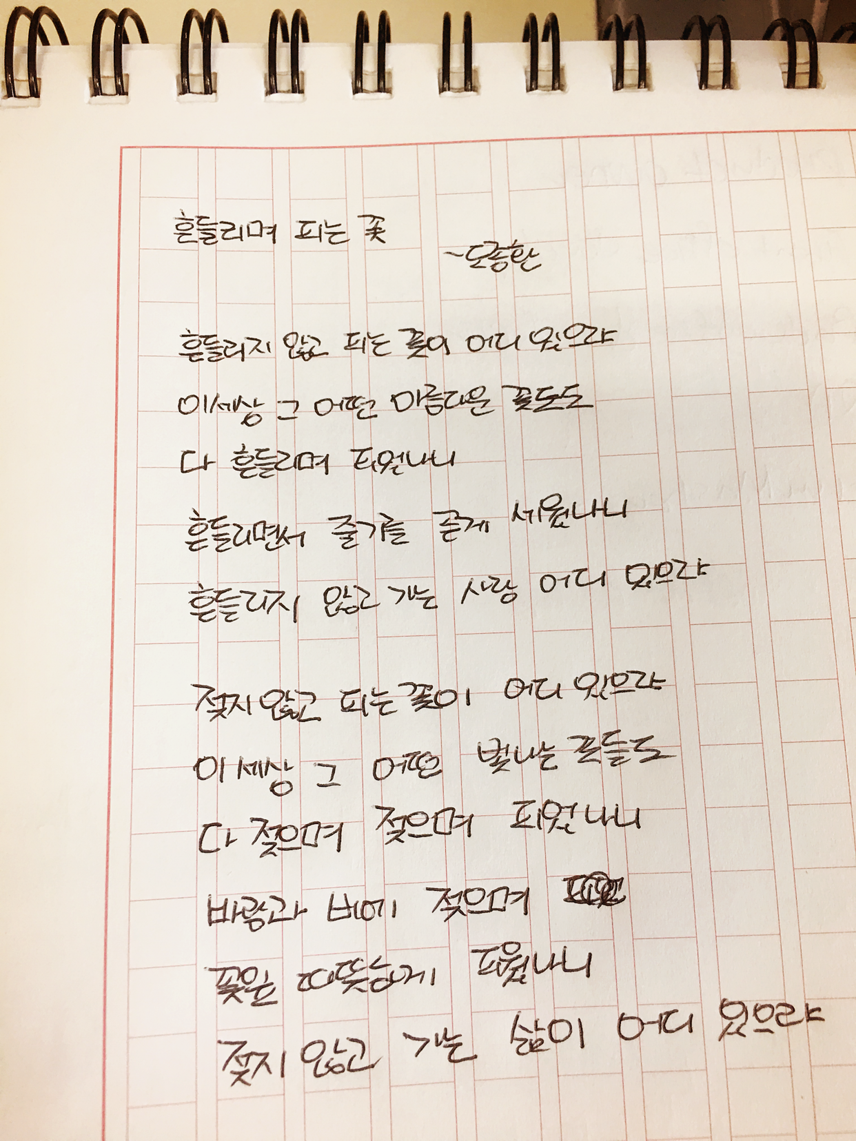 [0425]098_흔들리며 피는 꽃 by 도종환흔들리지 않고 피는 꽃이 어디 있으랴이 세상 그 어떤 아름다운 꽃들도 다 흔들리며 피었나니 흔들리면서 줄기를 곧게 세웠나니 흔들리지 않고 가는 사랑 어디 있으랴젖지 않고 피는 꽃이 어디 있으랴 이 세상 그 어떤 빛나는 꽃들도 다 젖으며 젖으며 피었나니 바람과 비에 젖으며 꽃잎 따뜻하게 피웠나니 젖지 않고 가는 삶이 어디 있으랴#1일1시 #100lab