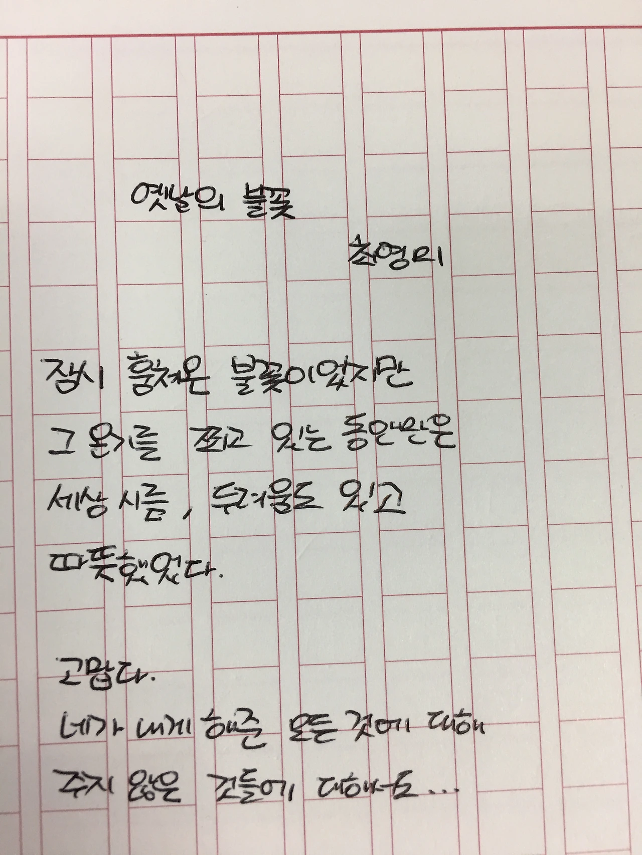 [0502]옛날의 불꽃 by 최영미 잠시 훔쳐온 불꽃이었지만 그 온기를 쬐고 있는 동안만은 세상 시름, 두려움도 잊고 따뜻했었다 고맙다 네가 내게 해준 모든 것에 대해 주지 않은 것들에 대해서도……
