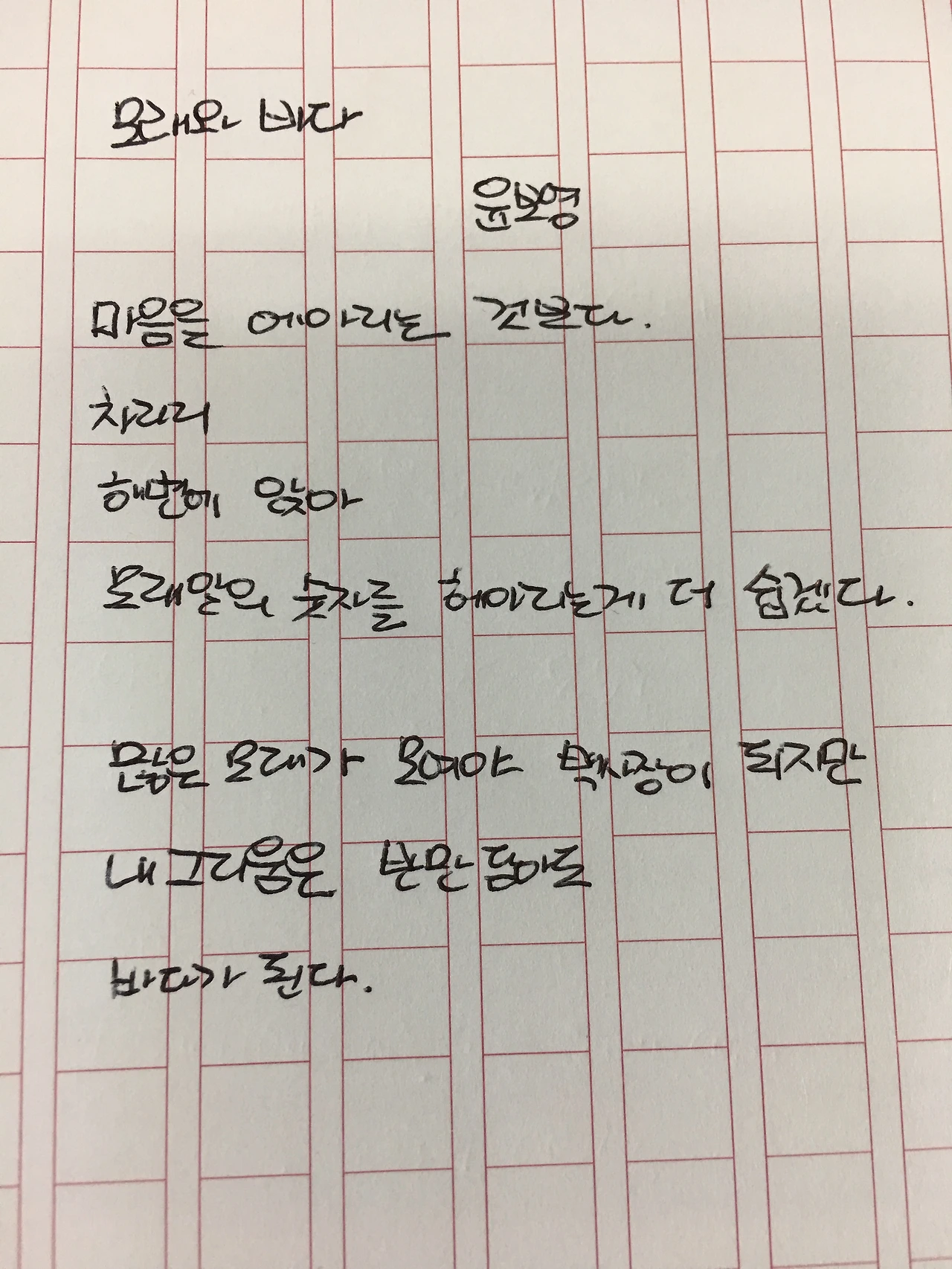 [0508] 모래와 바다 by 윤보영마음을 에아리는 것보다차라리,해변에 앉아모래알의 숫자를 헤아리는 게 더 쉽겠다많은 모래가 모여야 백사장이 되지만내 그리움은 반만 담아도바다가 된다