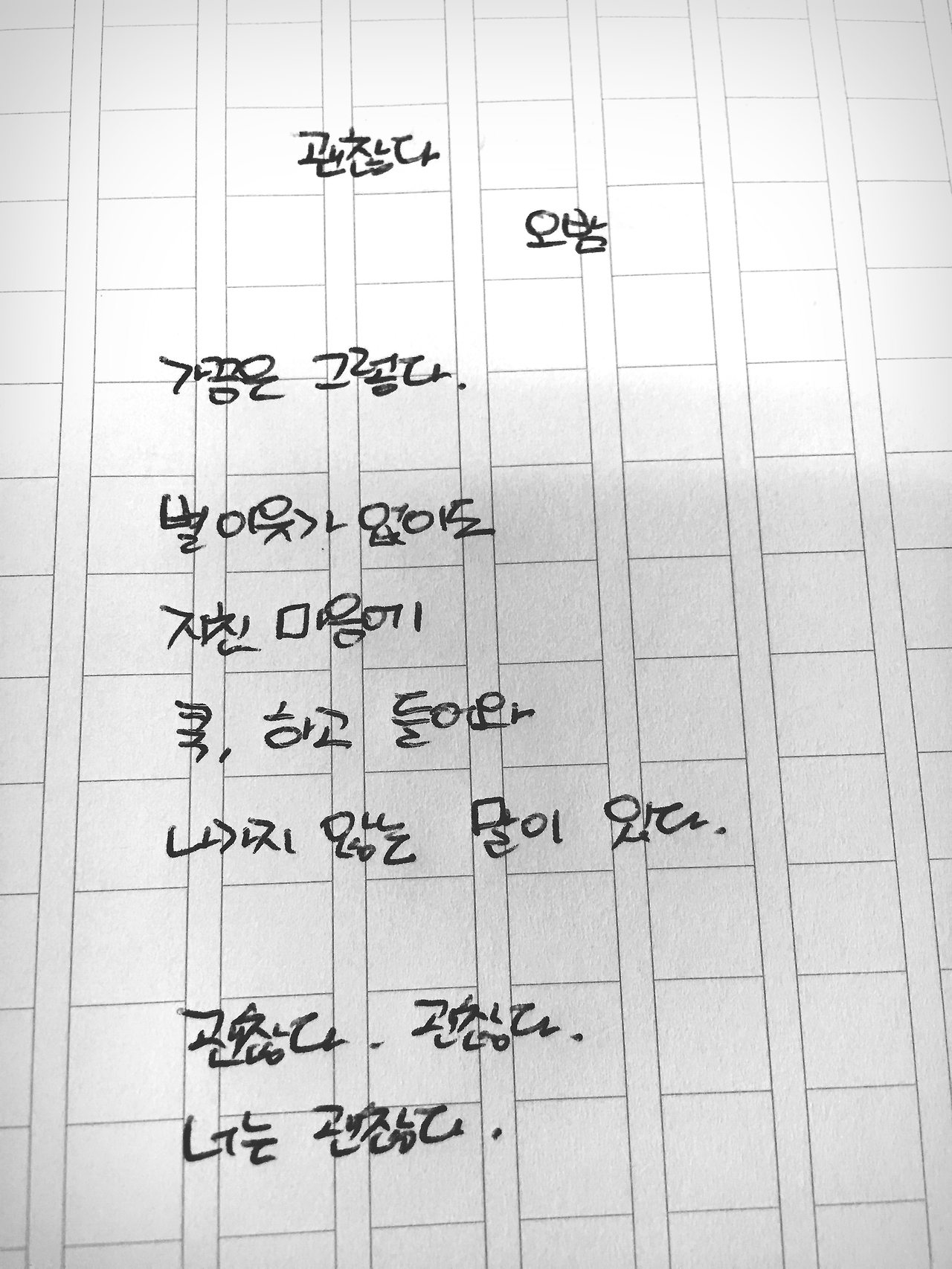 [0507] 괜찮다 by오밤가끔은 그렇다. 별 이유가 없이도지친 마음에쿡, 하고 들어와나가지 않는 말이 있다. 괜찮다. 괜찮다. 너는 괜찮다#1일1시