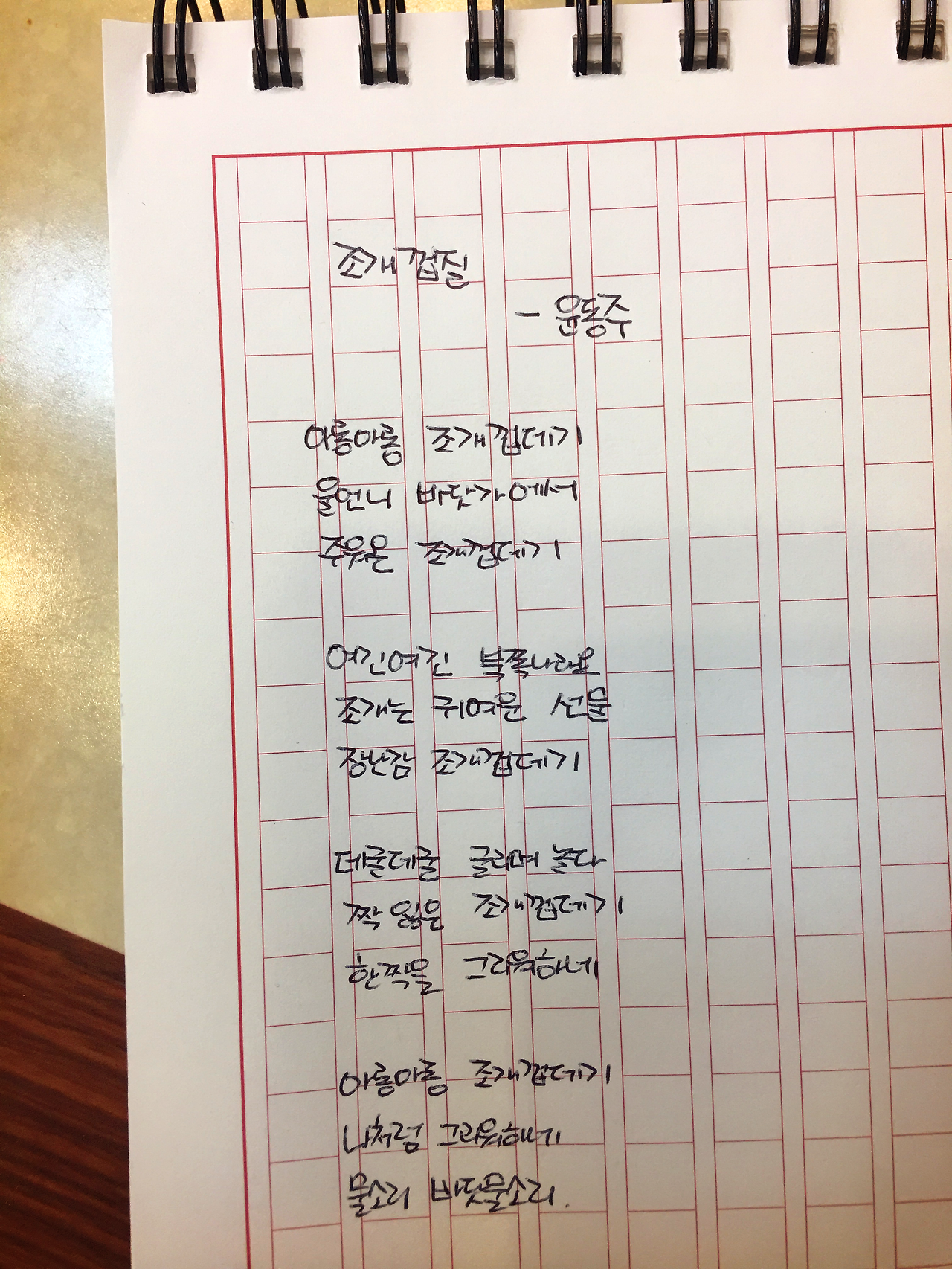 [0605] 005 조개껍질 by 윤동주아롱아롱 조개껍데기울언니 바닷가에서주워온 조개껍데기 여긴여긴 북쪽나라요조개는 귀여운 선물장난감 조개껍데기 데굴데굴 굴리며 놀다짝 잃은 조개껍데기한 짝을 그리워하네 아롱아롱 조개껍데기나처럼 그리워하네물소리 바닷물소리#1일1시 #100lab